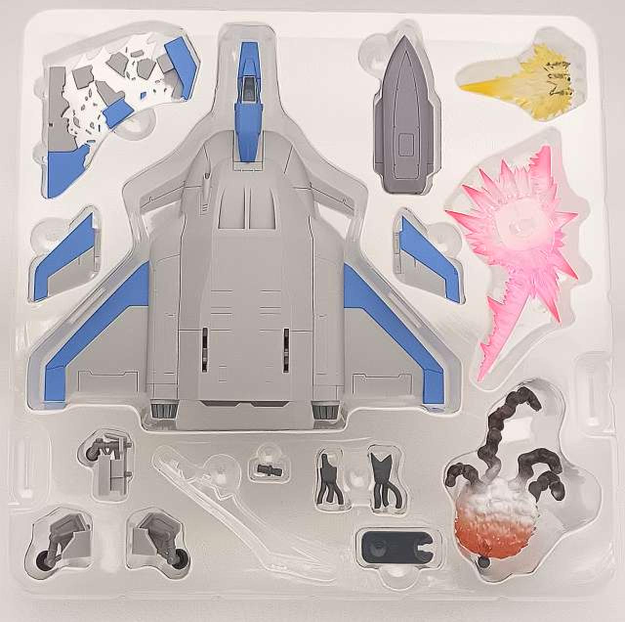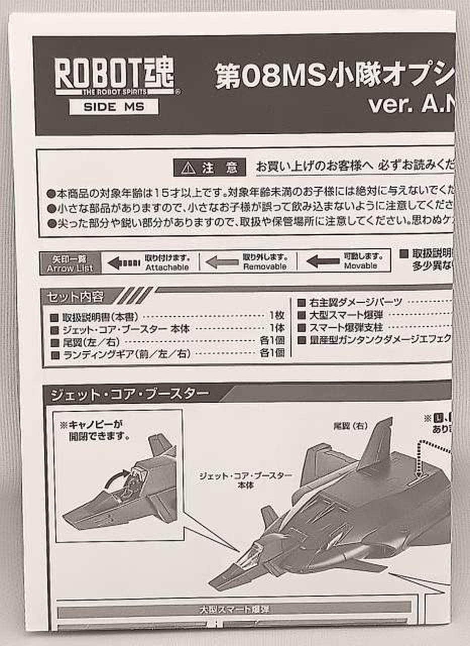 ジェット・コア・ブースター本体、尾翼(左右)、ランディングギア(前・左・右)、右主翼ダメージパーツ、大型スマート爆弾、スマート爆弾用支柱、量産型ガンタンクダメージエフェクト、交換用エフェクトピン、ピン交換サポート、Ez-8腕部ダメージパーツ(上・下)、グフ・カスタムダメージエフェクト、グフ・カスタムバルカンエフェクト、取扱説明書 |