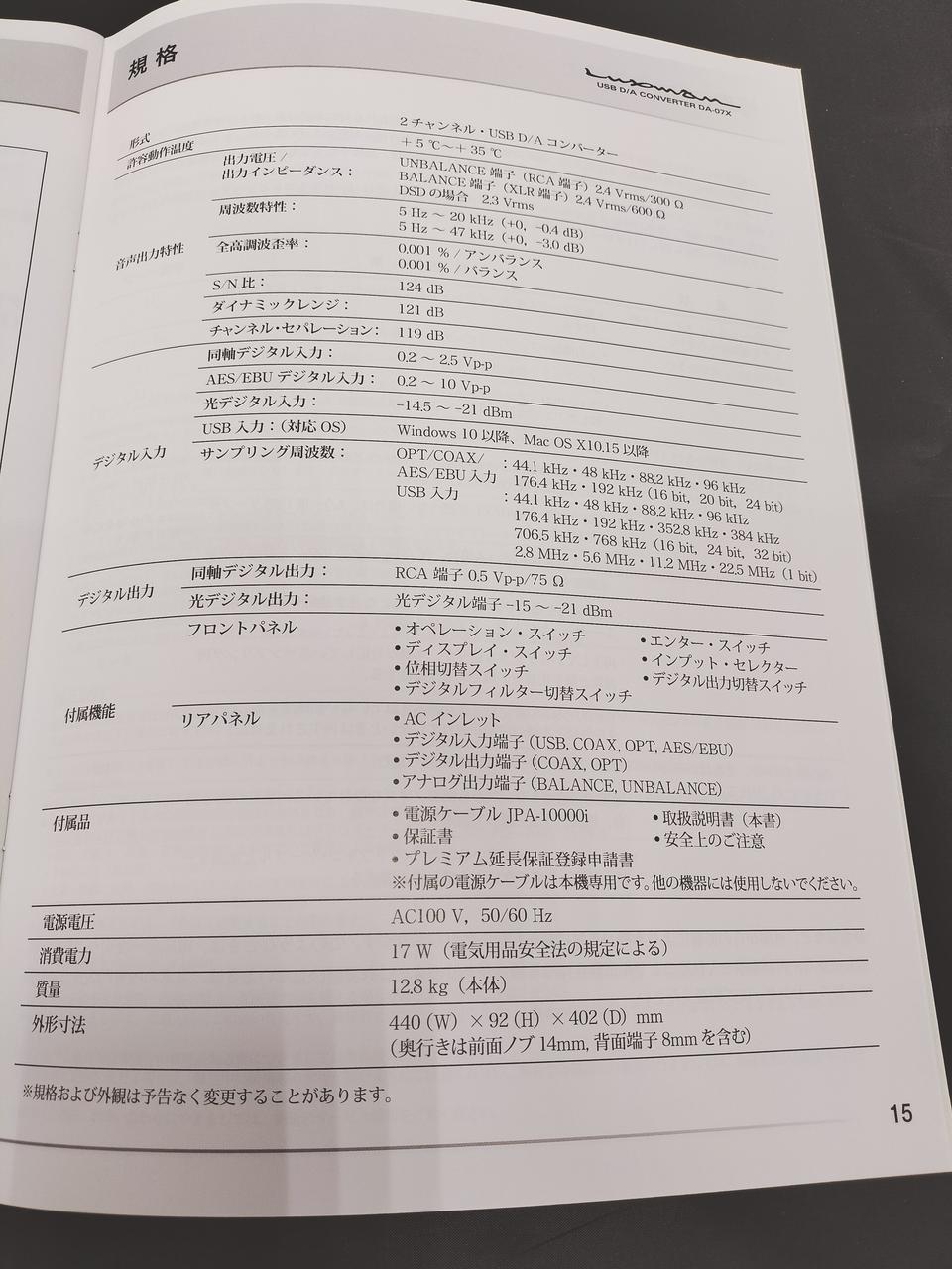周波数:5Hz〜47kHz(+0、-3.0dB)、S/N比:124dB、電圧:AC100V(50 / 60Hz) |