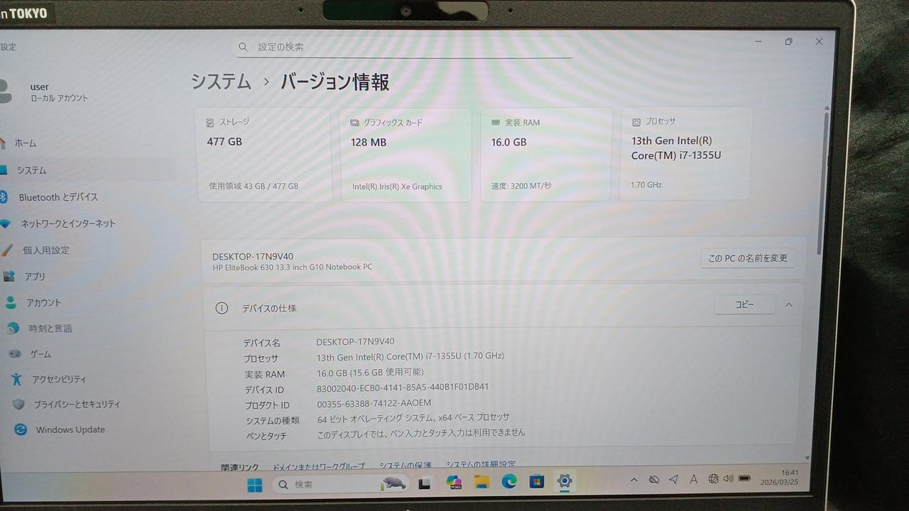 OS:Win11Pro CPU:Core i7-1355U 1.70GHz メモリ:16GB SSD:512GB |