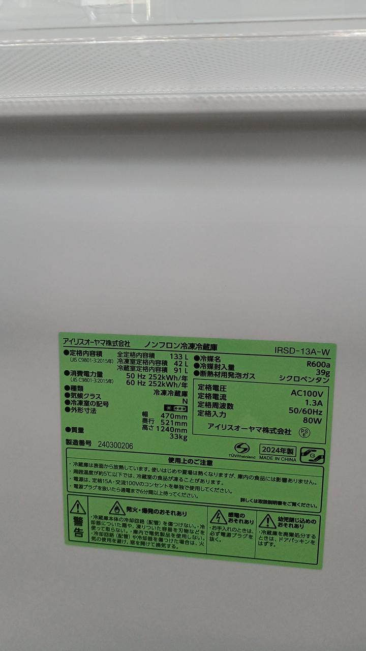 店頭受け取り商品 2024年製 定格内容積 :133 L(冷蔵:91L/冷凍:42L) 幅470x高さ1240x奥行521 mm |