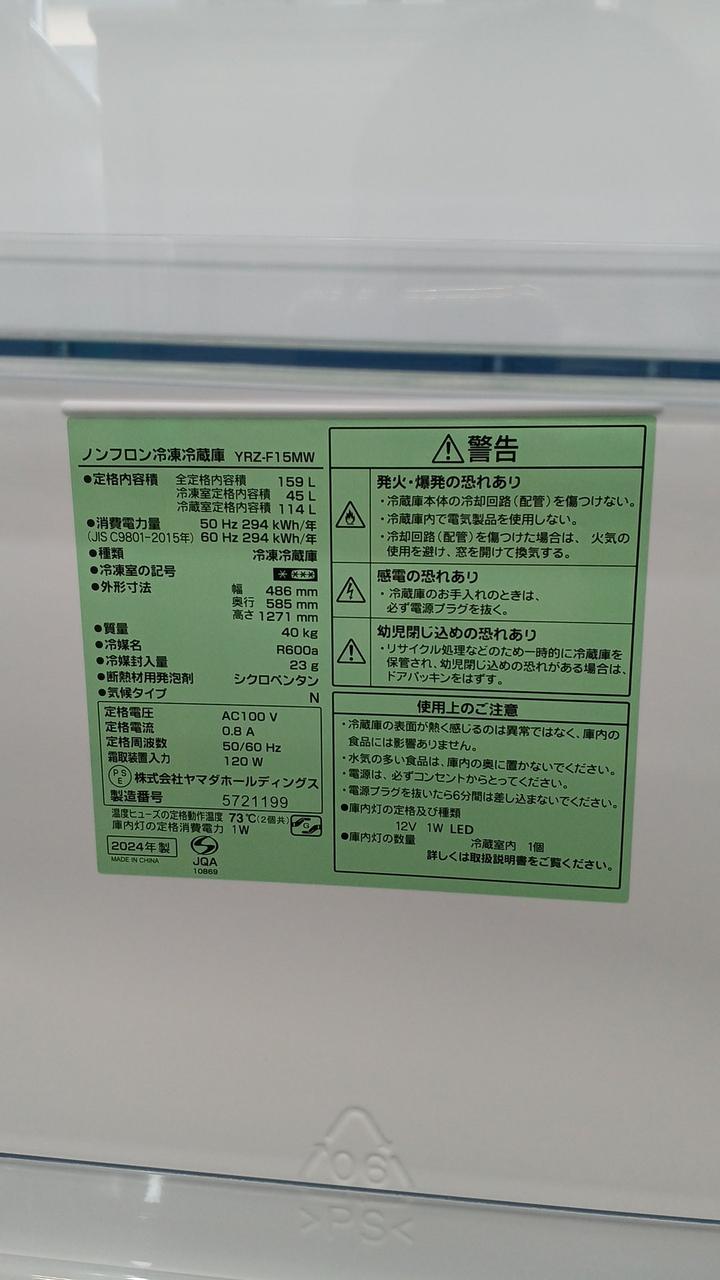 店頭受け取り商品 2024年製 総容量:159L(冷蔵:114L/冷凍:45L) 幅486×奥行き585×高さ1,271mm |