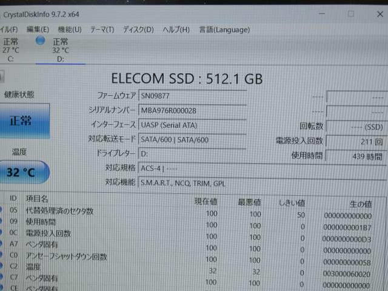 電源投入回数:211回 使用時間:439時間 判定:正常(%表示なし) |