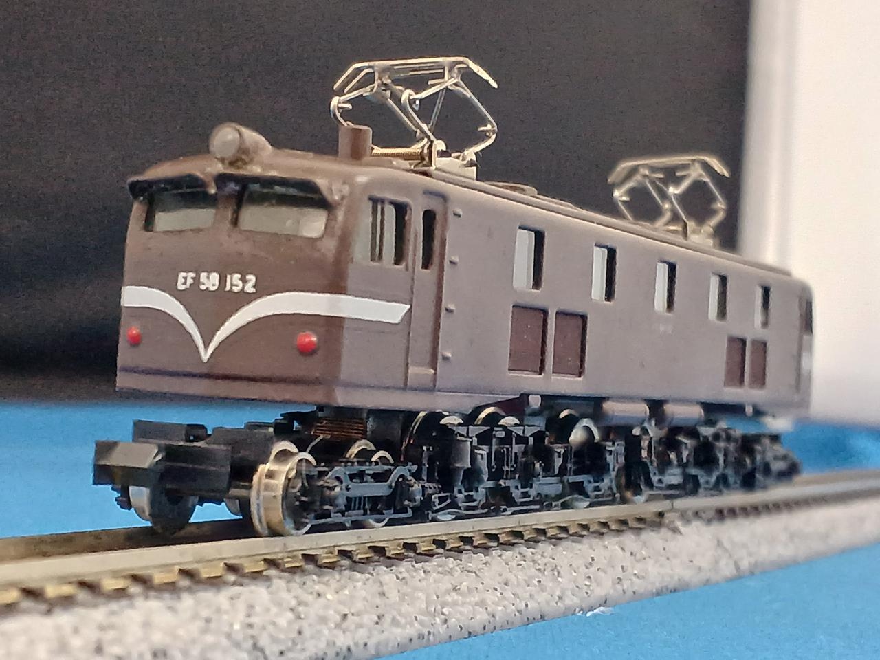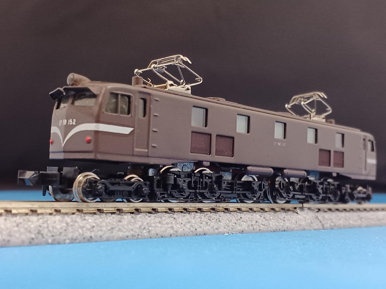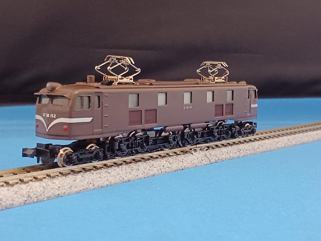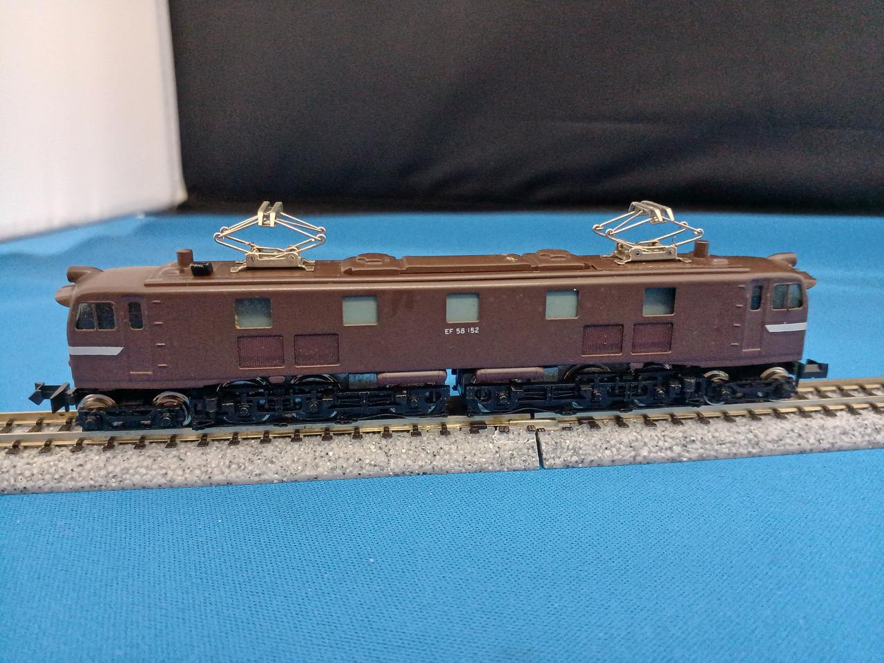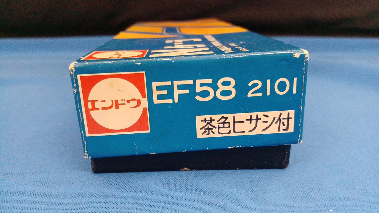 エンドウのEF58です。かつて70年代後半から80年代にかけてHOゲージメーカー御三家のエンドウもNゲージに参入していた時期がありました。HOゲージ製造のノウハウをそのまま、Nゲージに活かしての金属製車体が特徴でした。また金属車体を活かしてステンレスカーの製品化も得意でした。エンドウのEF58はちょうどブルトレブーム時に出て24系25形100番台の牽引を想定していたようですが、当時ゴハチが該当車種のブルトレ牽引を担当していたのは新大阪・下関間の安芸だけ、14系寝台なら東京始発のいなば・紀伊だけで、かなりニッチだったかと思います。エンドウのゴハチは他にも青大将色、ブルトレ色、限定品で真鍮無塗装もありました。