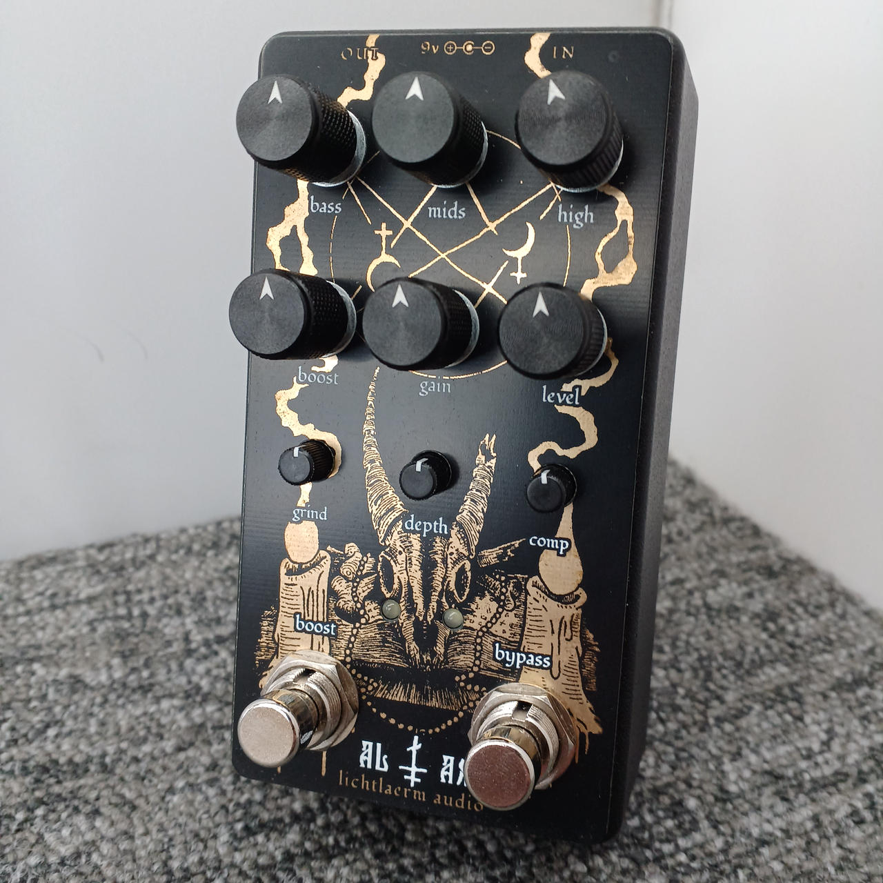 grindやdepth,compなどといった普段歪みペダルでは見かけないノブがついていますが