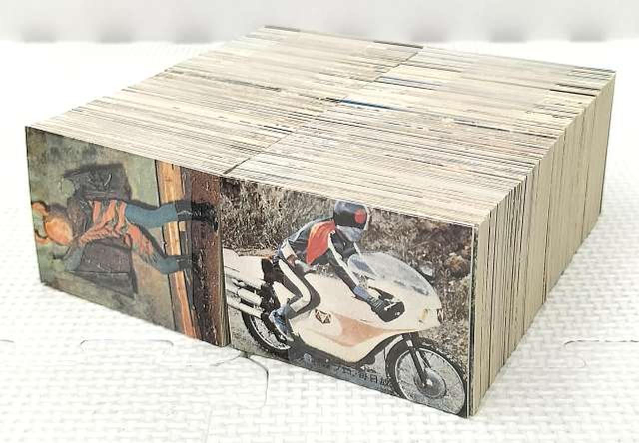 ①『仮面ライダースナック』のおまけカードコレクション。スタンダード版全546種+途中から新サイクロンの図版に変更された異種同一番号の3種、計549枚。(※「提供、カルビー製菓」という文字は削除) |