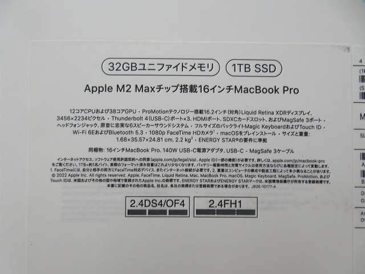 OS:mac OS(未開封の為バージョン不明) CPU:Apple M2 Max メモリ:32GB SSD:1TB |