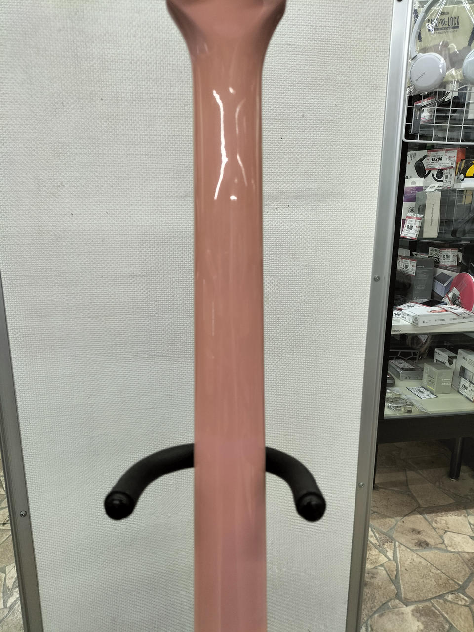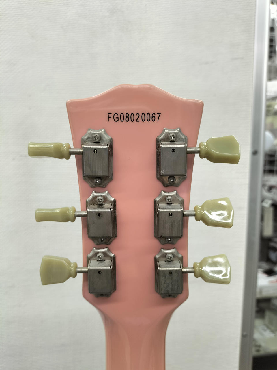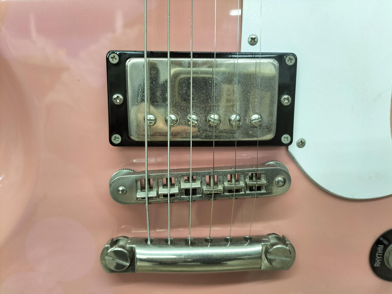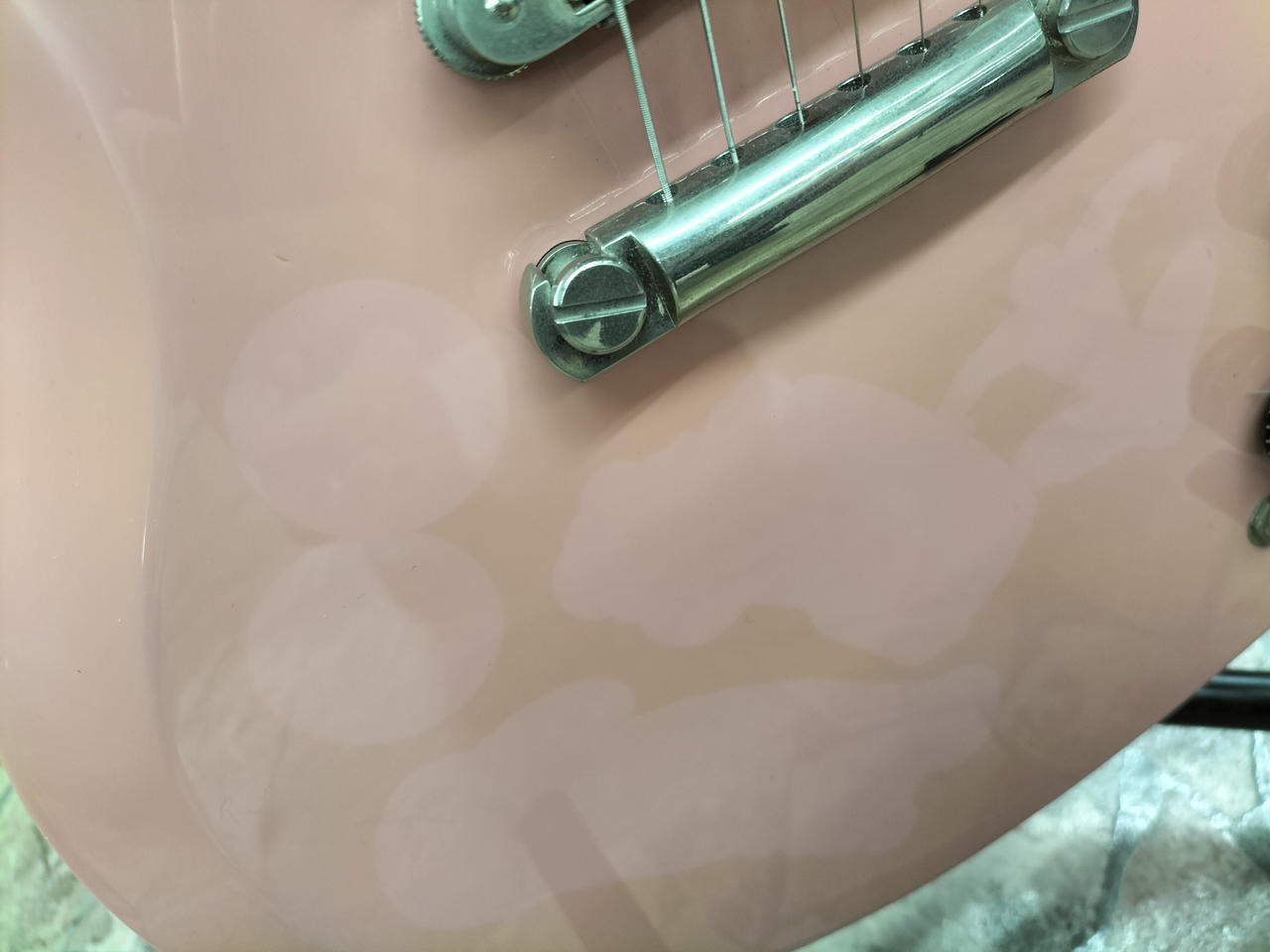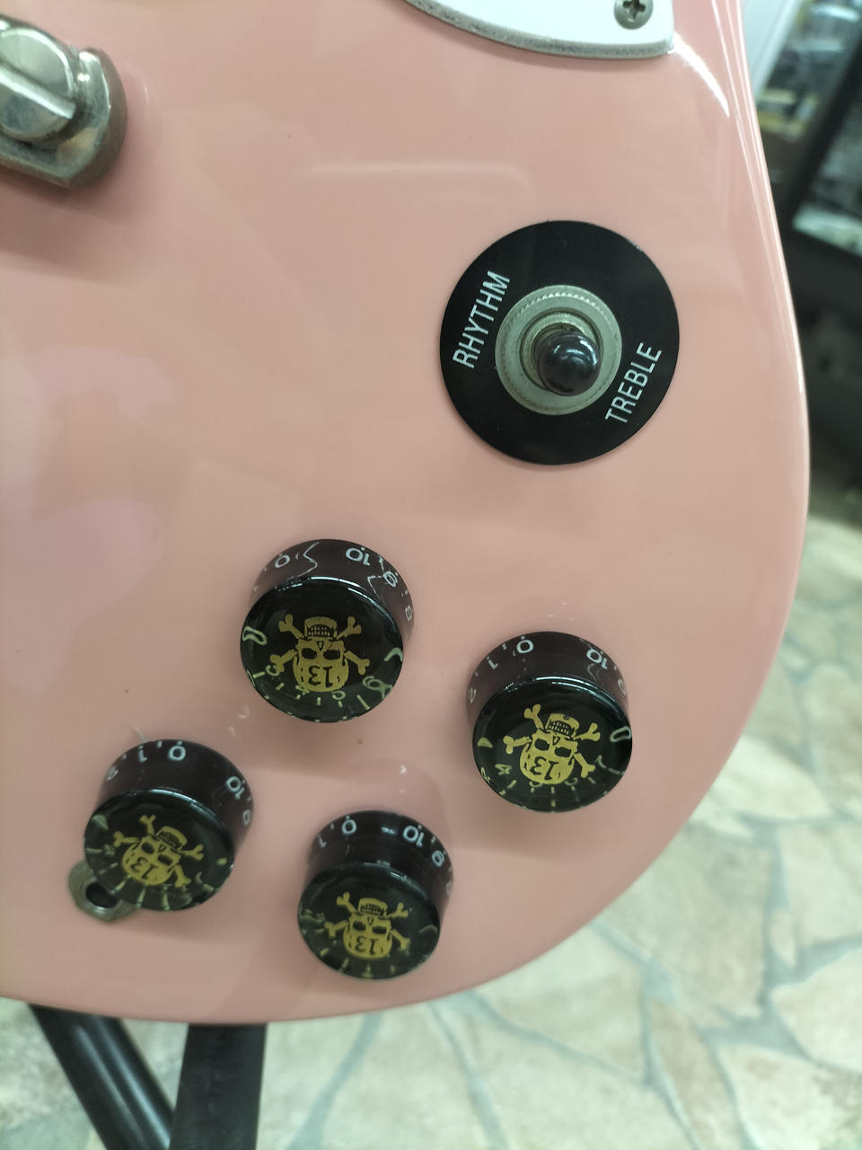 ピンクのボディにどくろマークが特徴的なギターです。