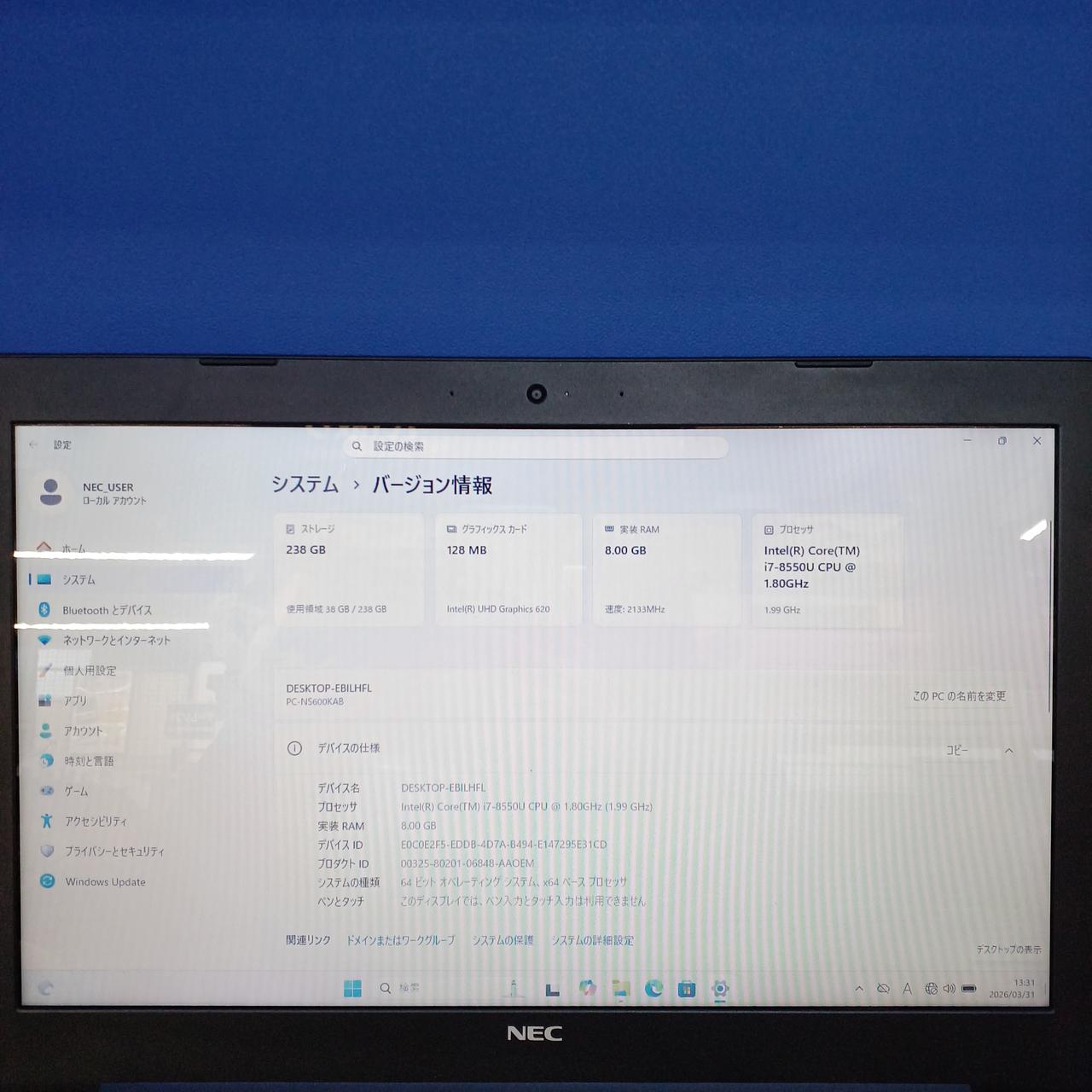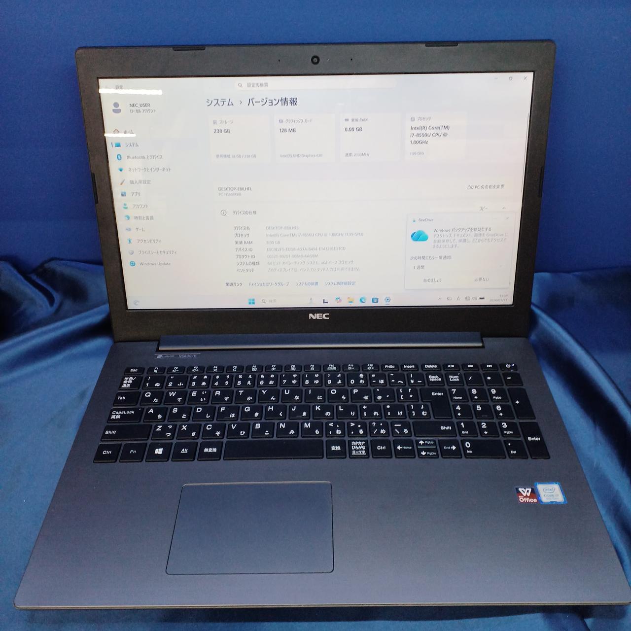 15.6 型 WXGA (1366x768) CPU:Core i7 8550U@1.8GHz |