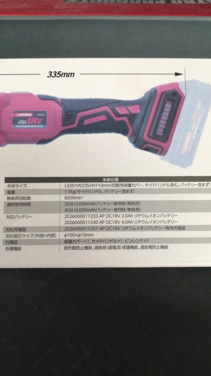 無負荷回転数:8,500min-1 最大連続使用時間:約40分(4,000mAhバッテリー使用時) |