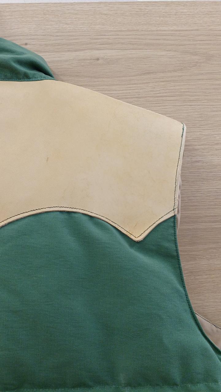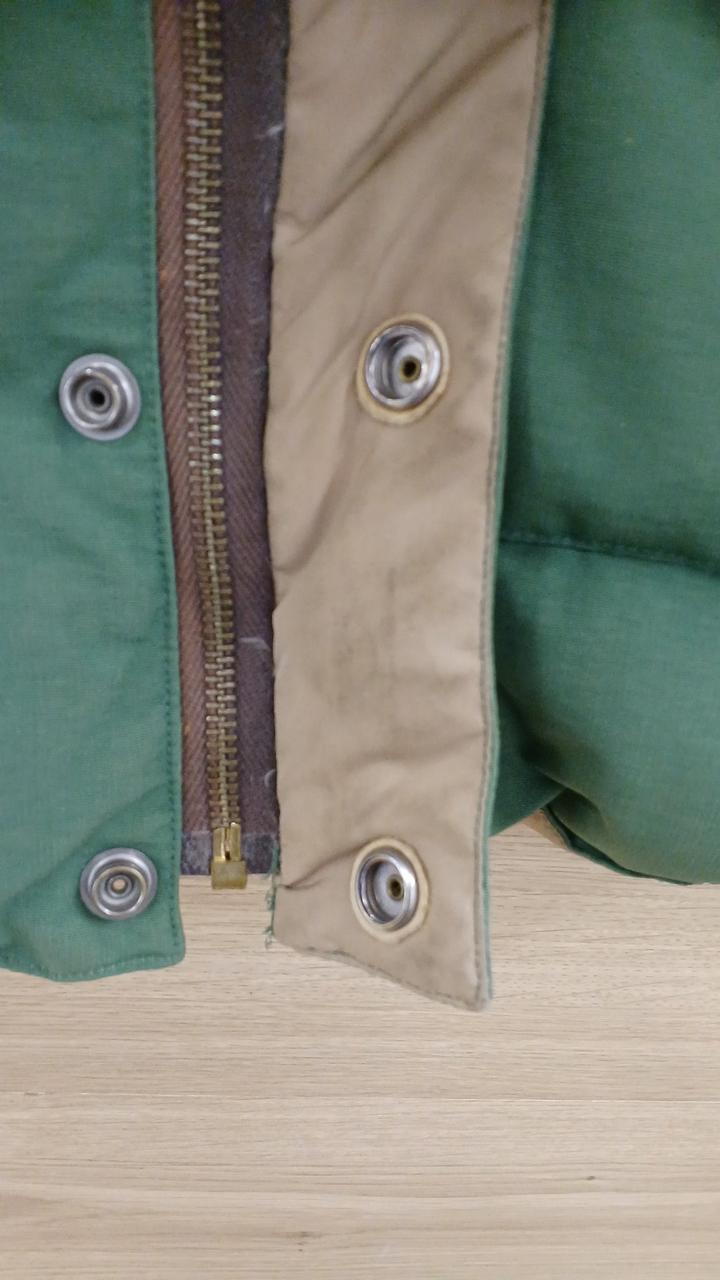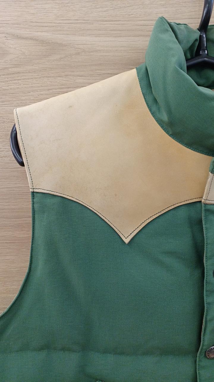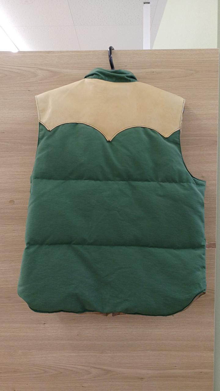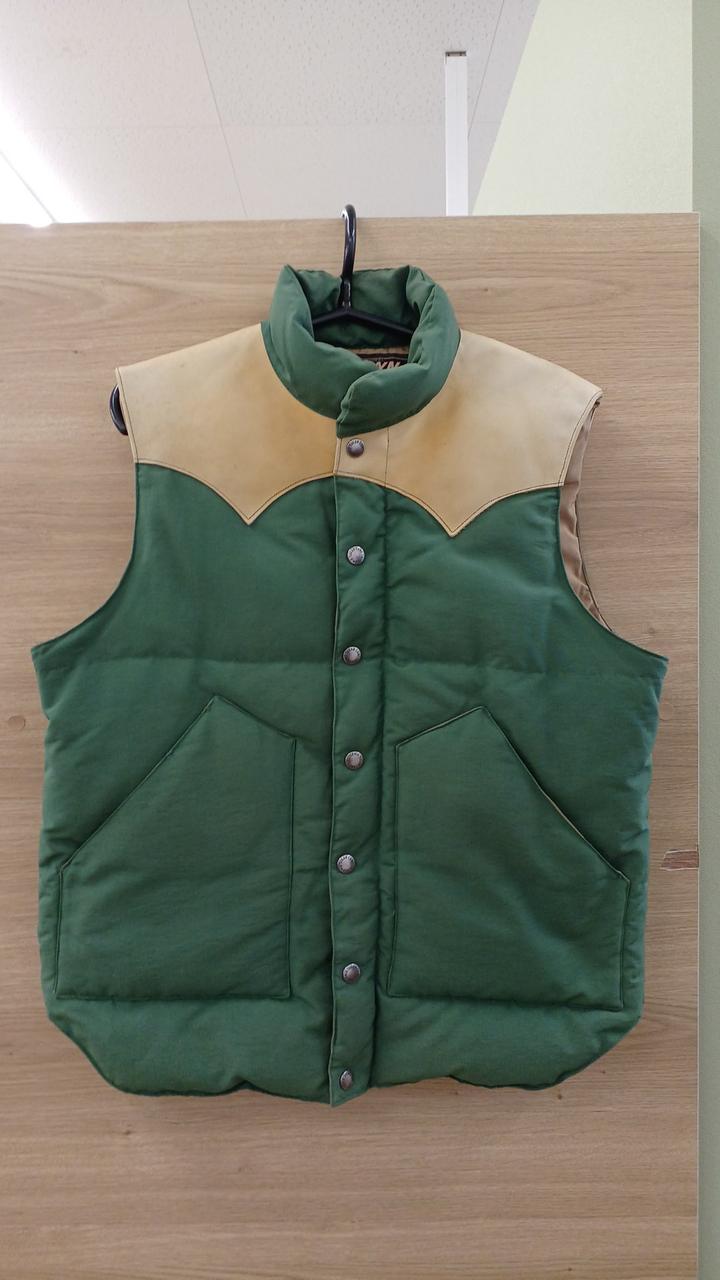 グリーンとベージュの配色がよく、肉厚なダウンベストです!