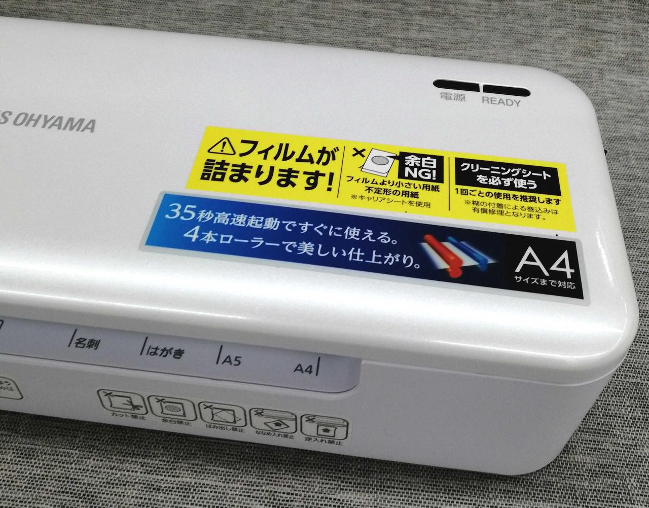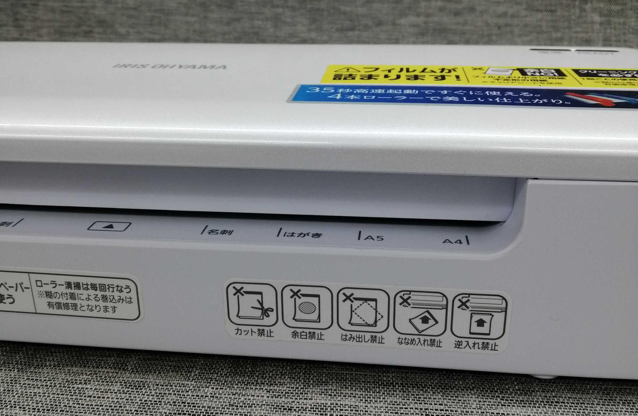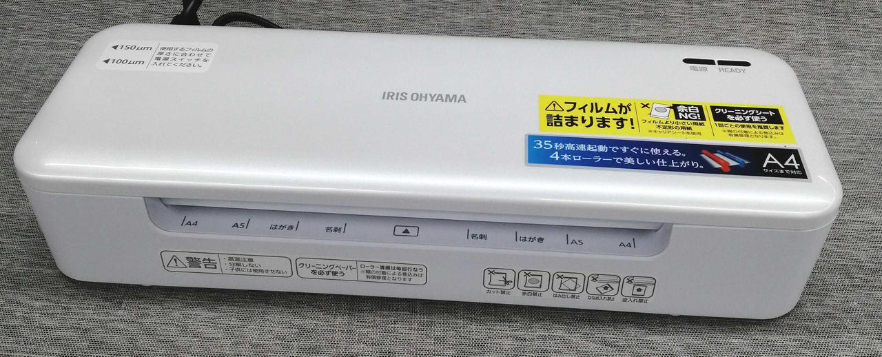 対応サイズ:A4(厚さ150μまで) 機能:オートリバース/ヒーターオートオフ ウォームアップ時間:35秒 |