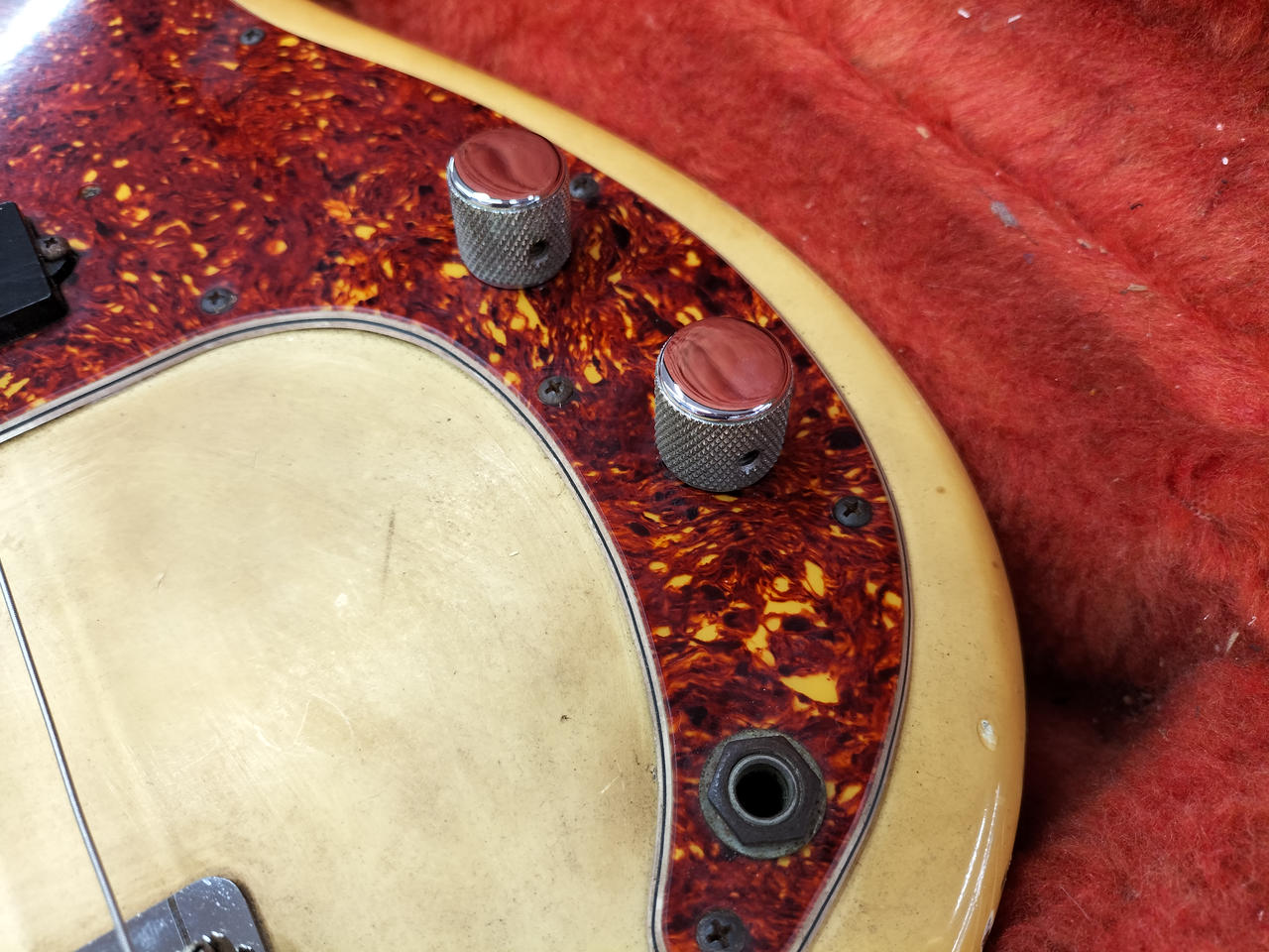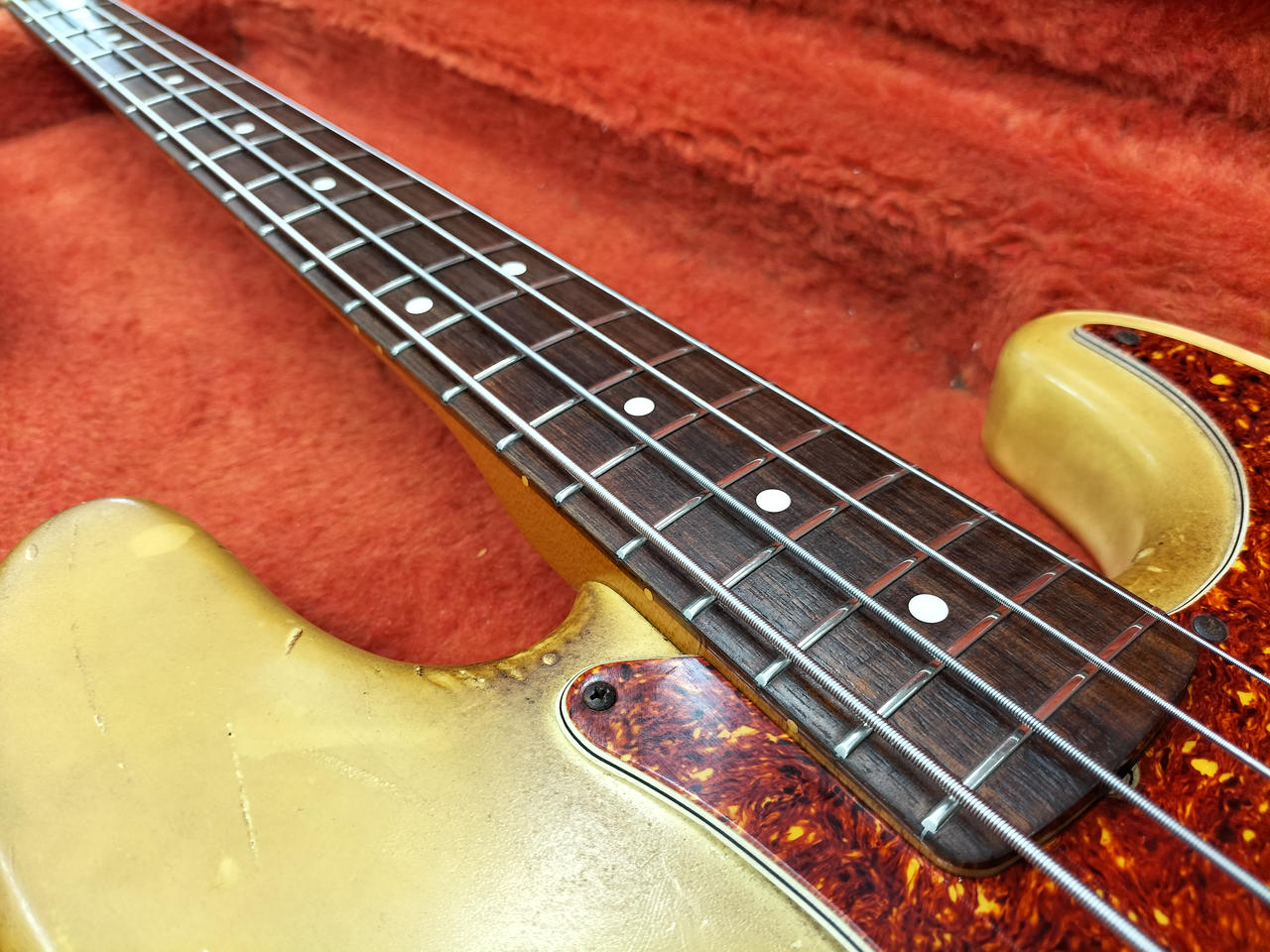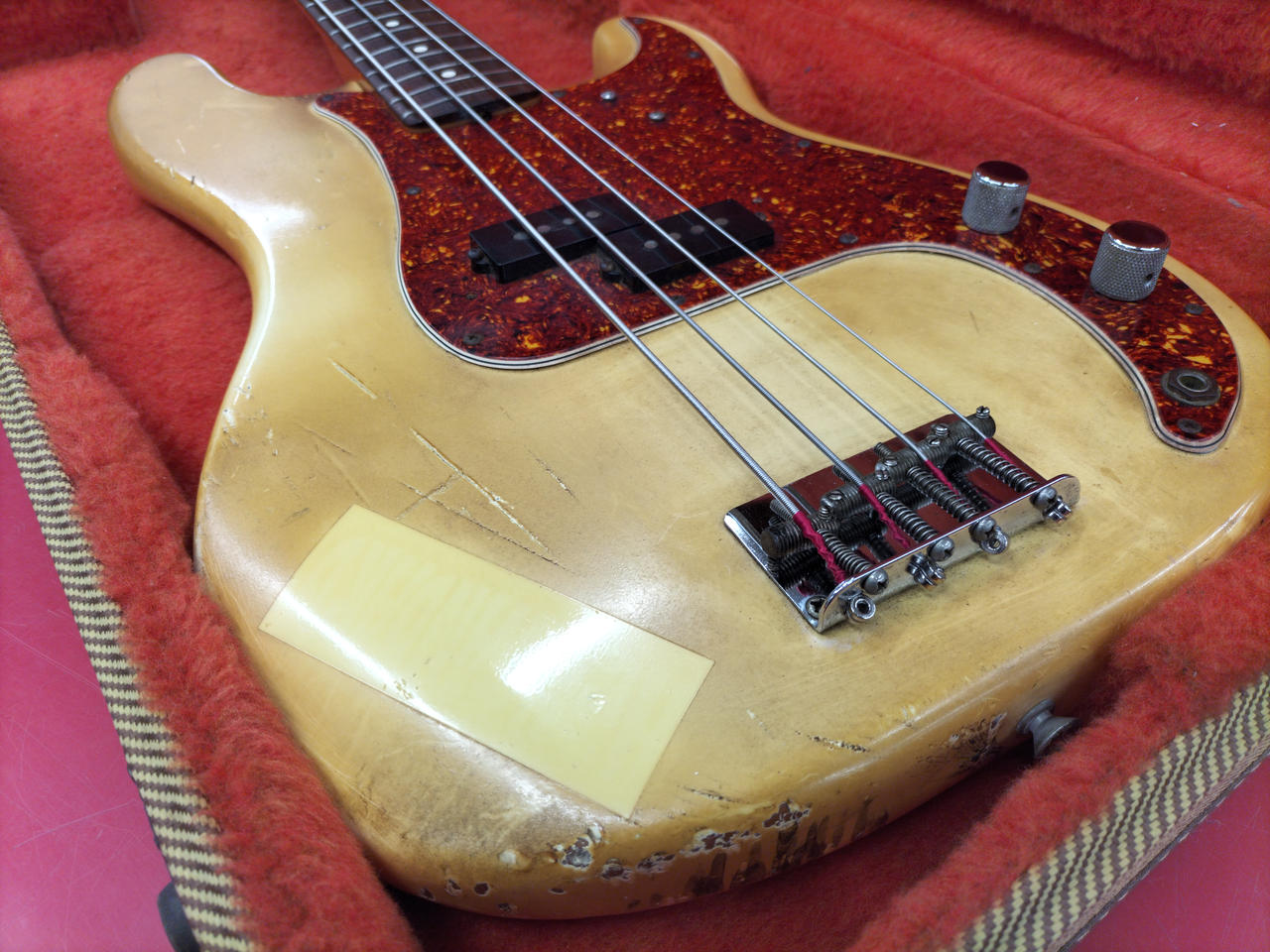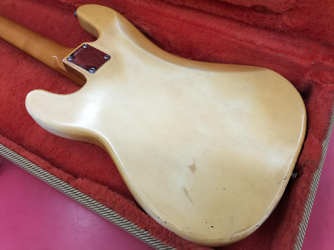 もともとのホワイトボディがヤケており、ビンテージ感のある渋いルックスです! |