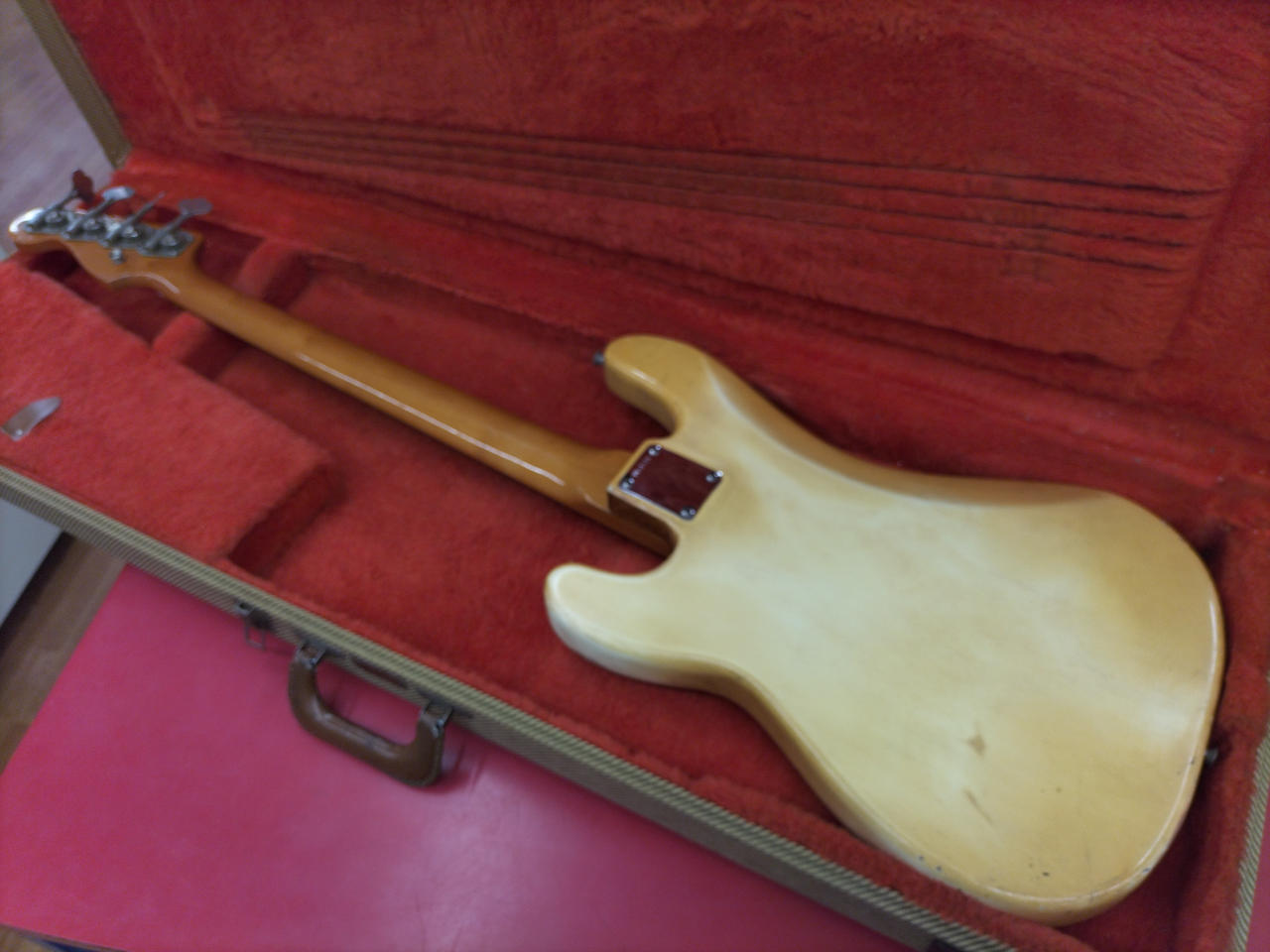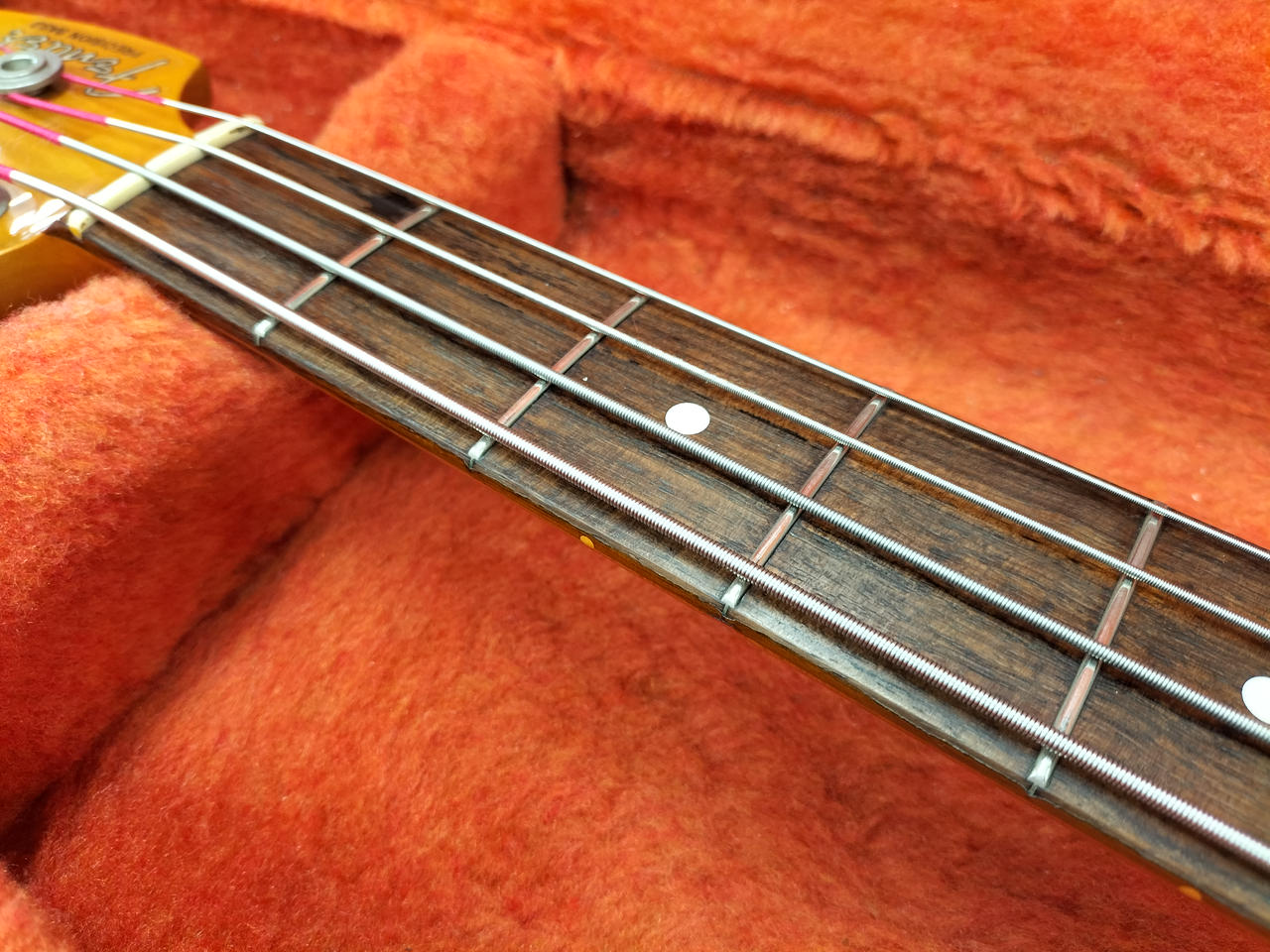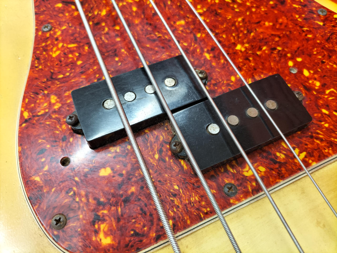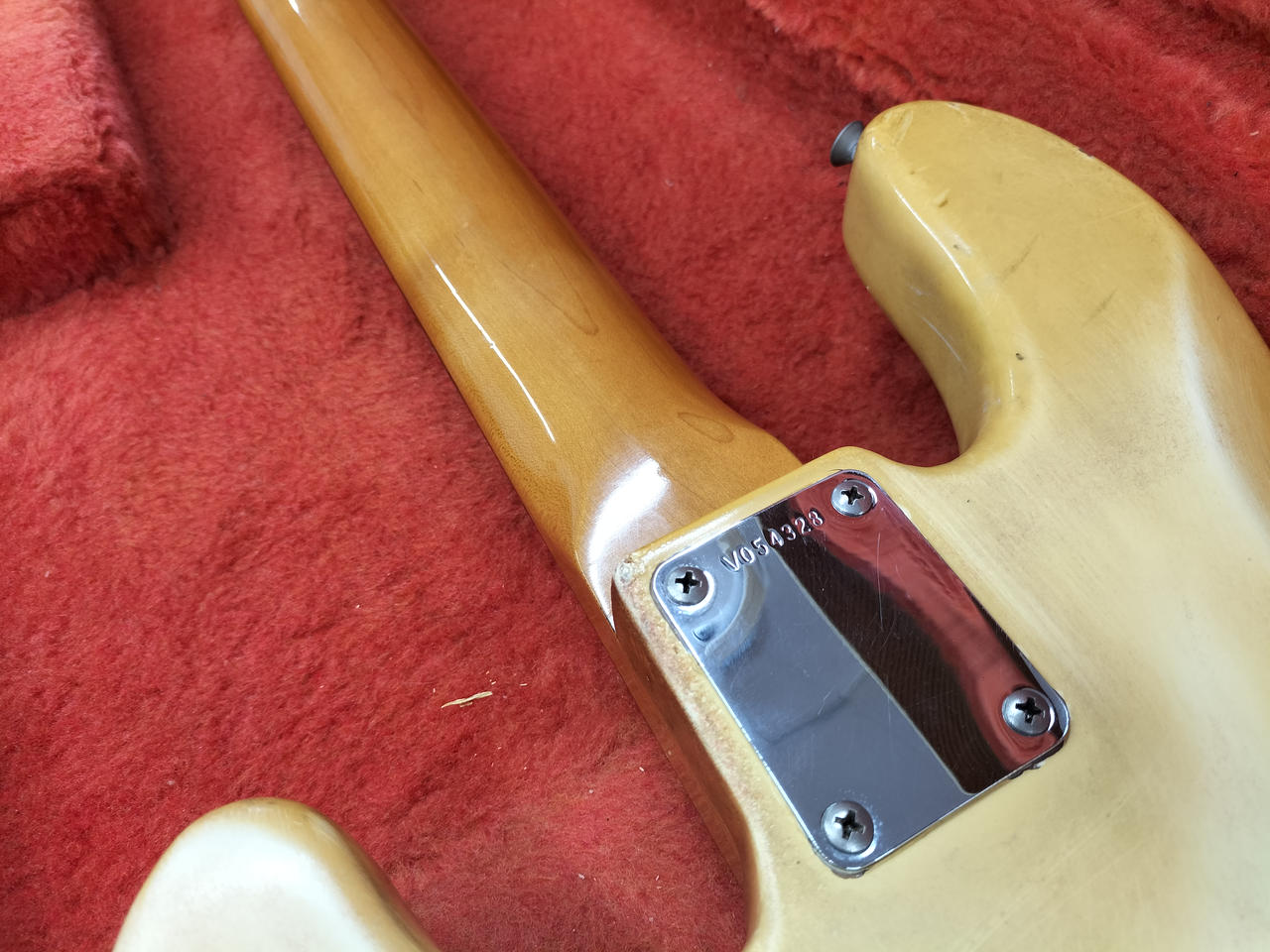 もともとのホワイトボディがヤケており、ビンテージ感のある渋いルックスです! |