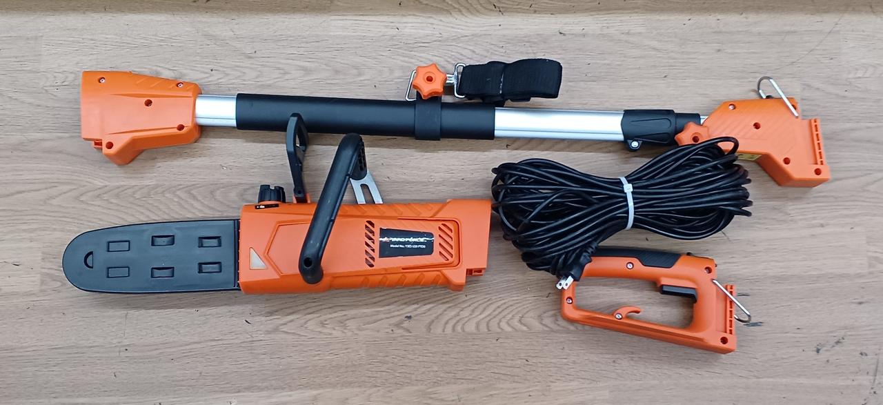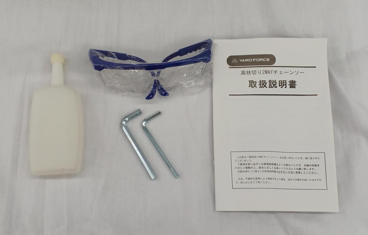 ハンドチェーンソー、電源ユニット、伸縮ポール、ソーカバー、チェーンオイル(微量)、肩ベルト、M5六角棒レンチ、M8六角棒レンチ、ゴーグル、取説 |