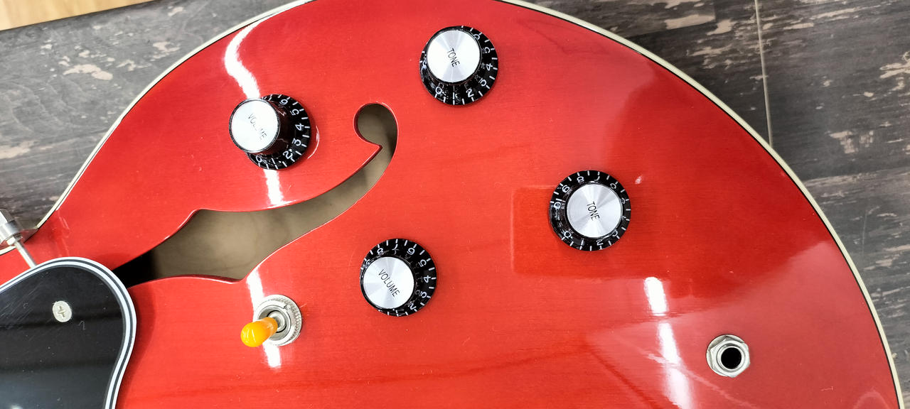 トラディショナルなFホールセミホロウメイプルボディ、メイプルセットネック、オバンコール指板。 |