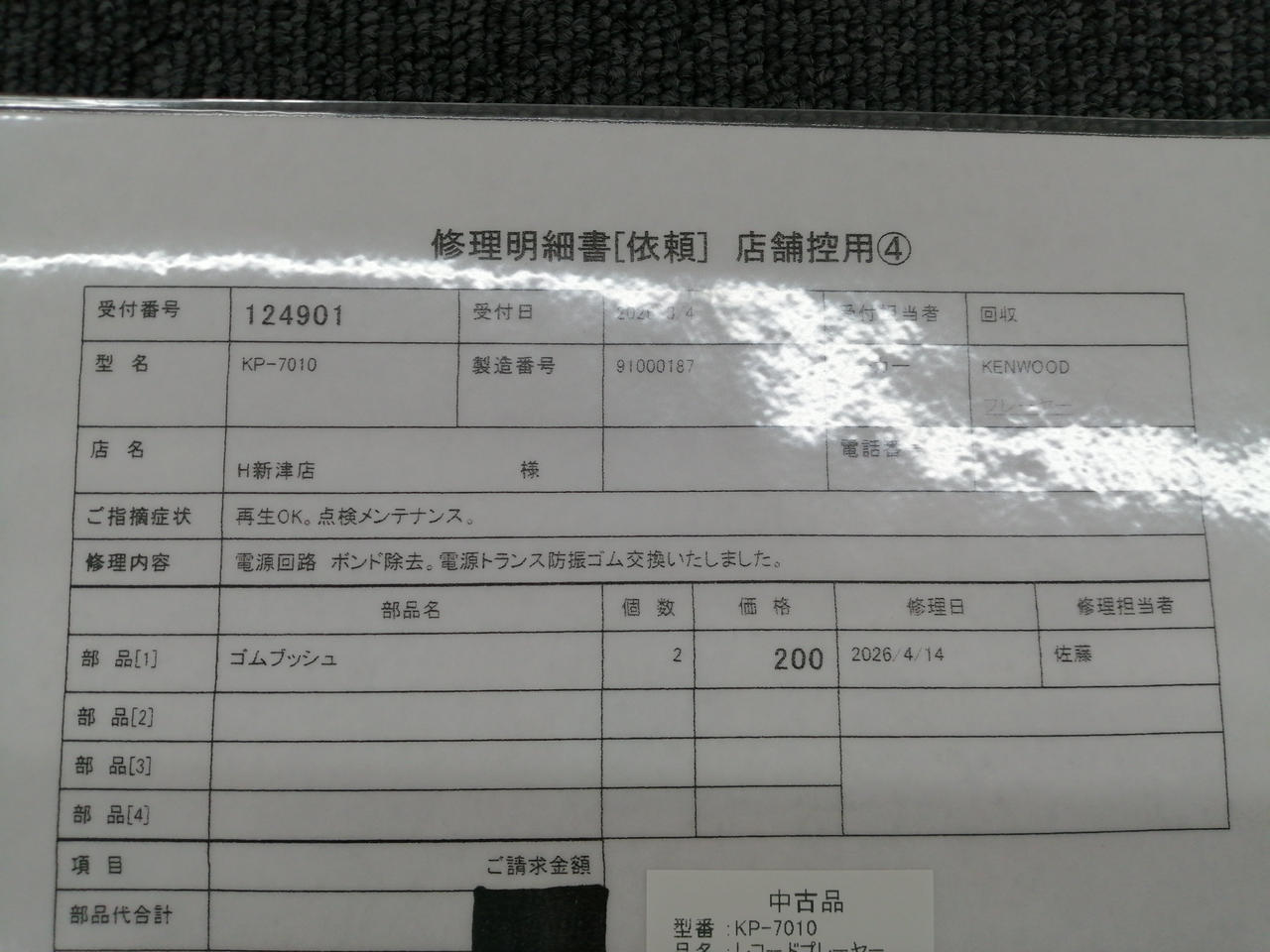 メンテナンス内容:電源回路 ボンド除去。電源トランス防振ゴム交換いたしました。 |