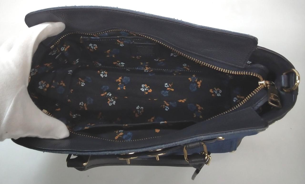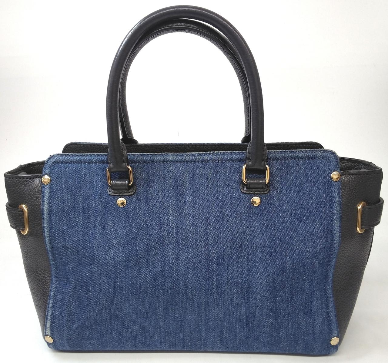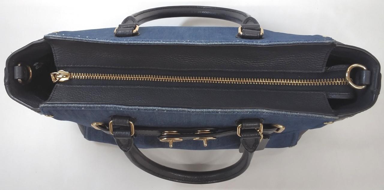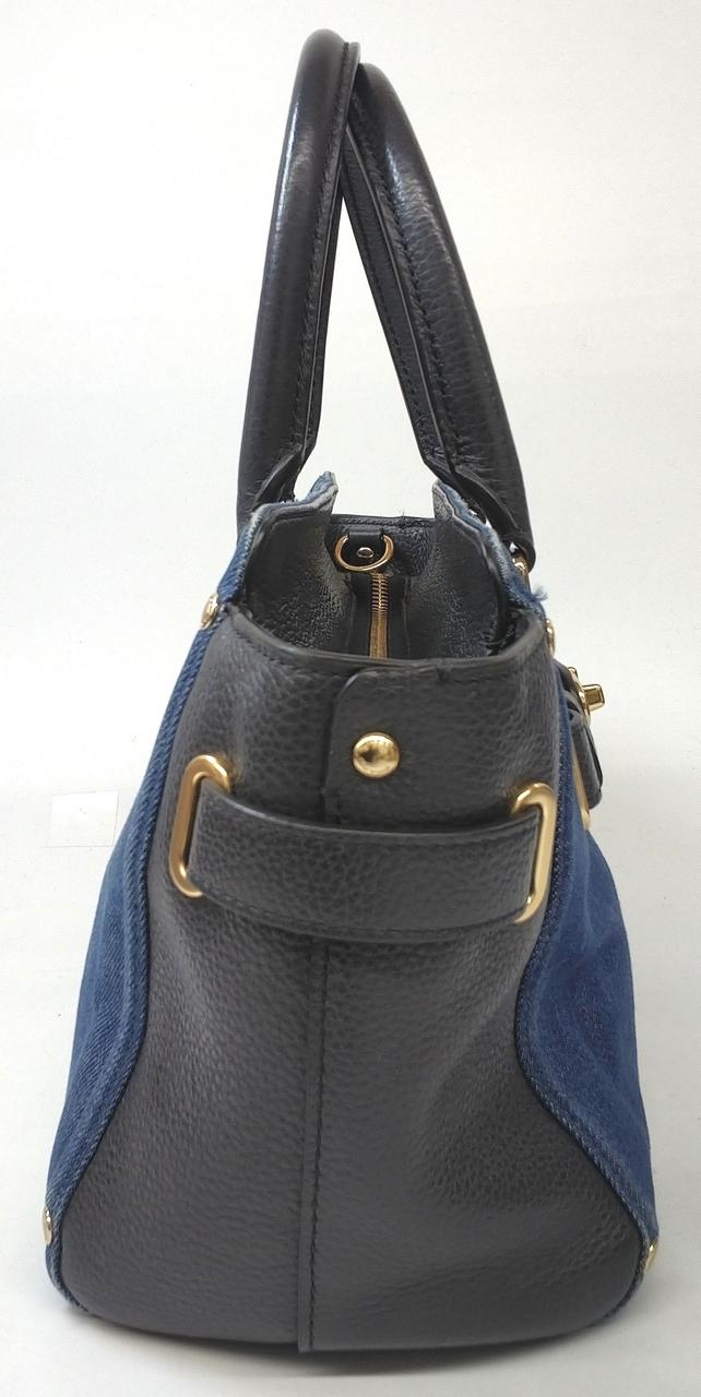 デニム素材とブラックレザーを組み合わせたコンビネーションデザインが特徴で、ターンロックの金具がアクセントになっています。