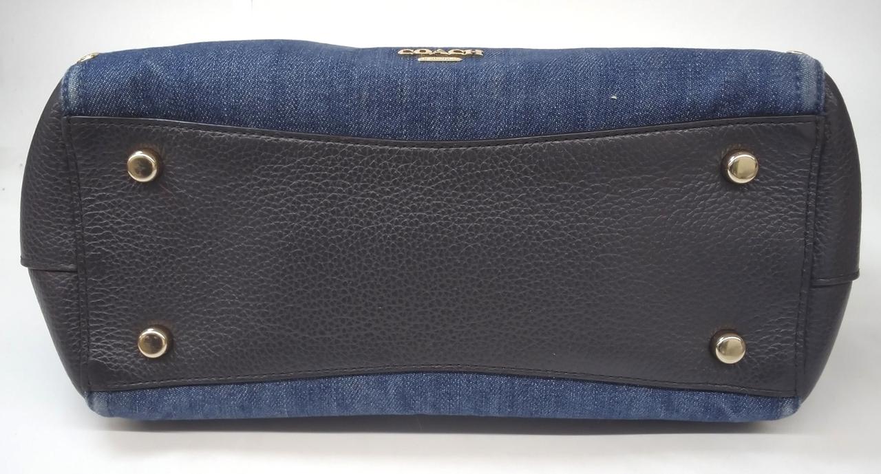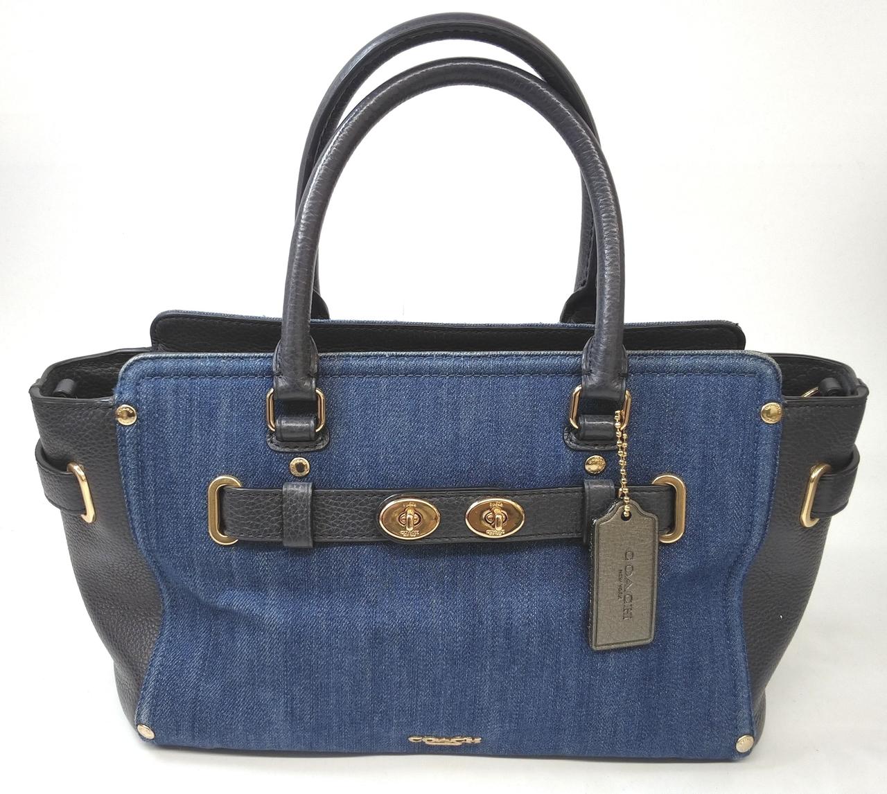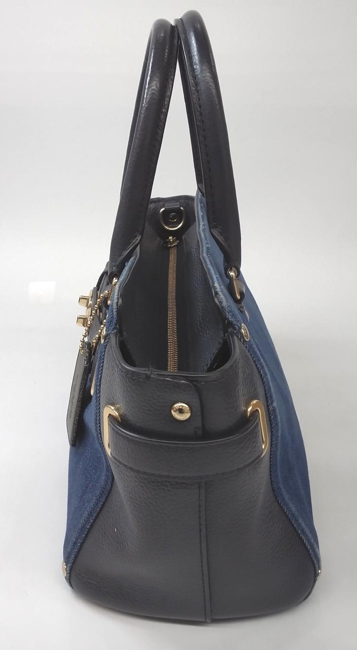 デニム素材とブラックレザーを組み合わせたコンビネーションデザインが特徴で、ターンロックの金具がアクセントになっています。