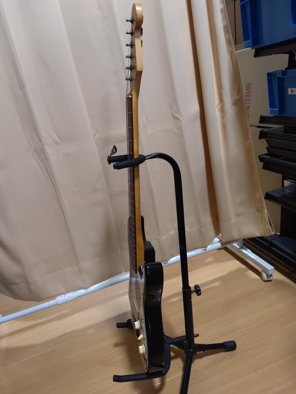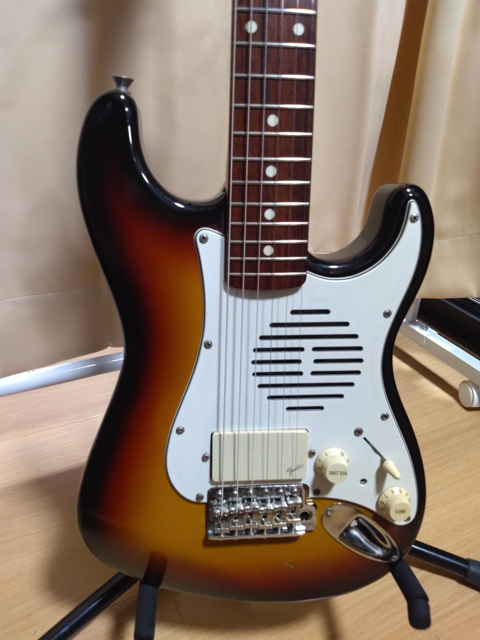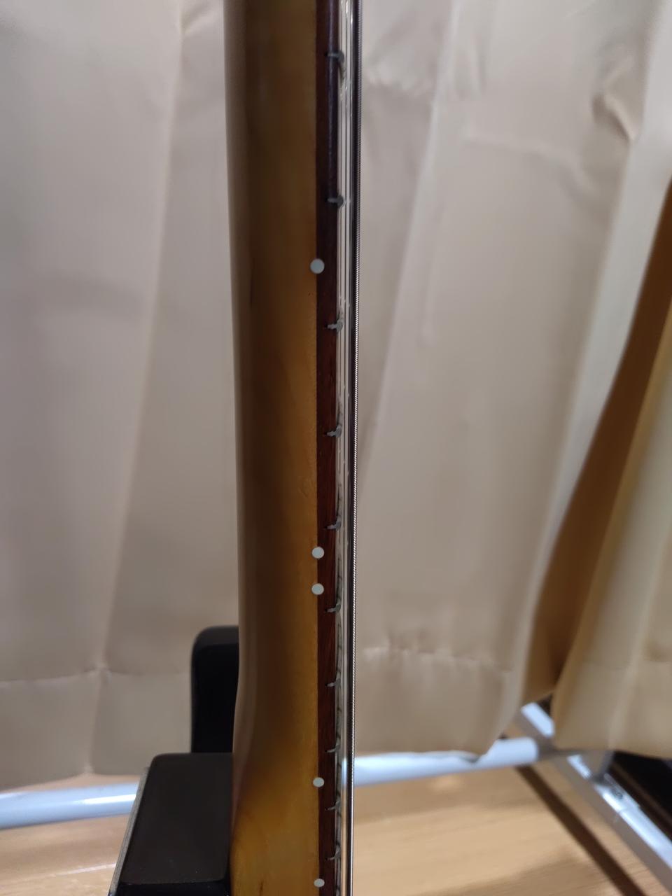 9V電池稼働、コンパクトなサイズで610mmスケールの22フレット仕様 コントロールはVol/Tone・OFF-ON-Dist切り替えスイッチになっています 弦高12フレット約2.5mm フレット残量約80% フレット溝にやや隙間あり ※本体のみ、トレモロアーム欠品 |