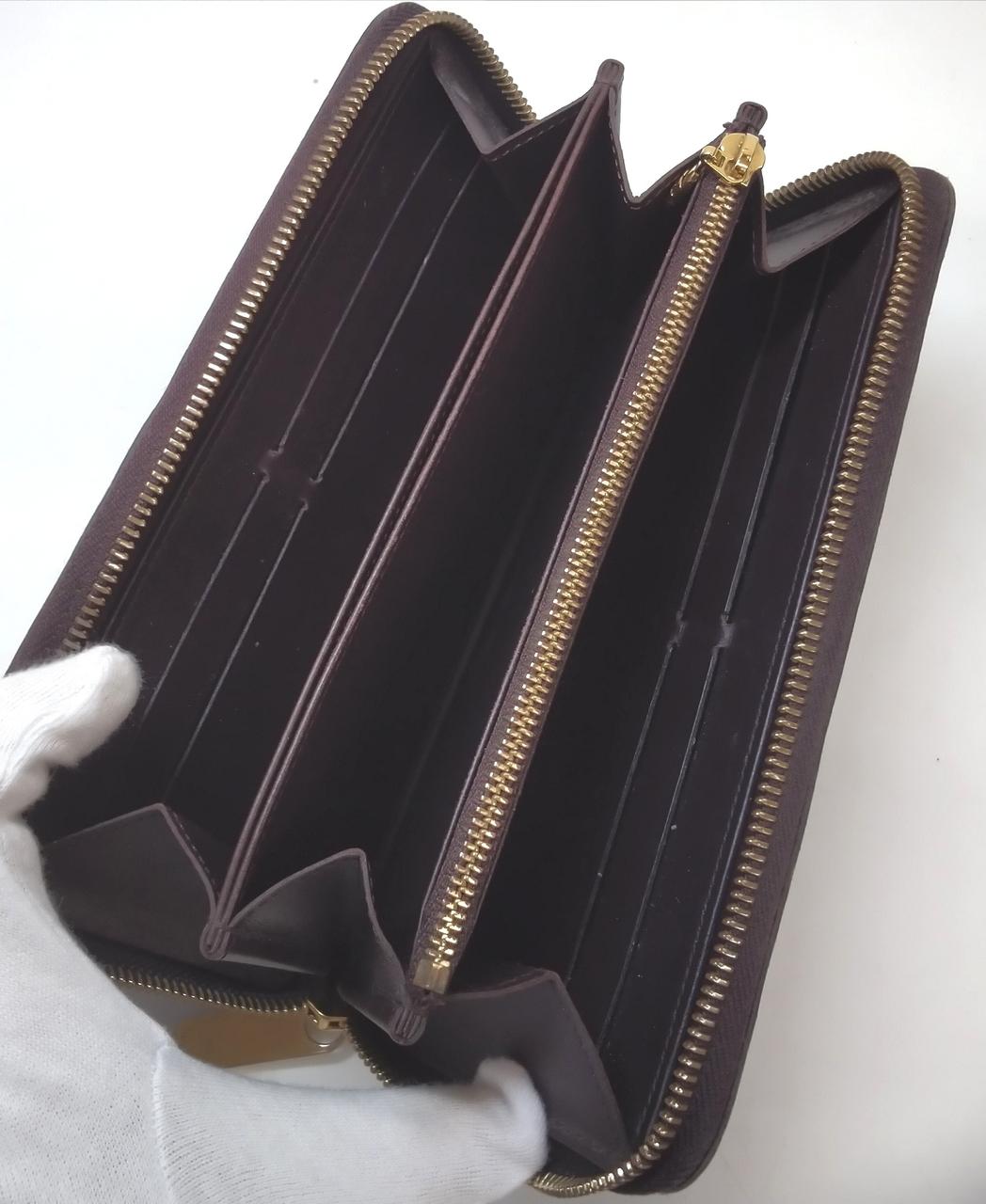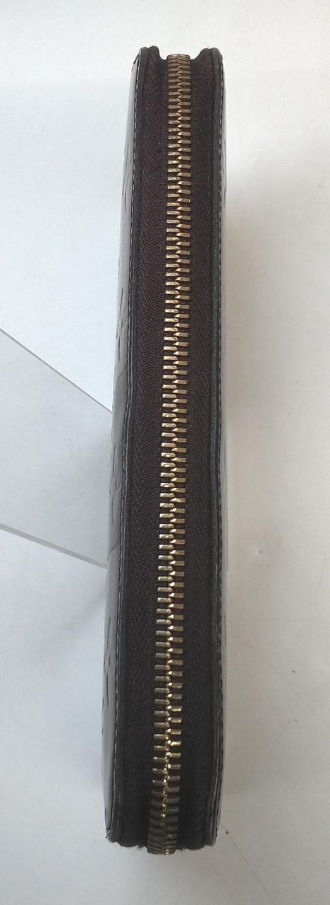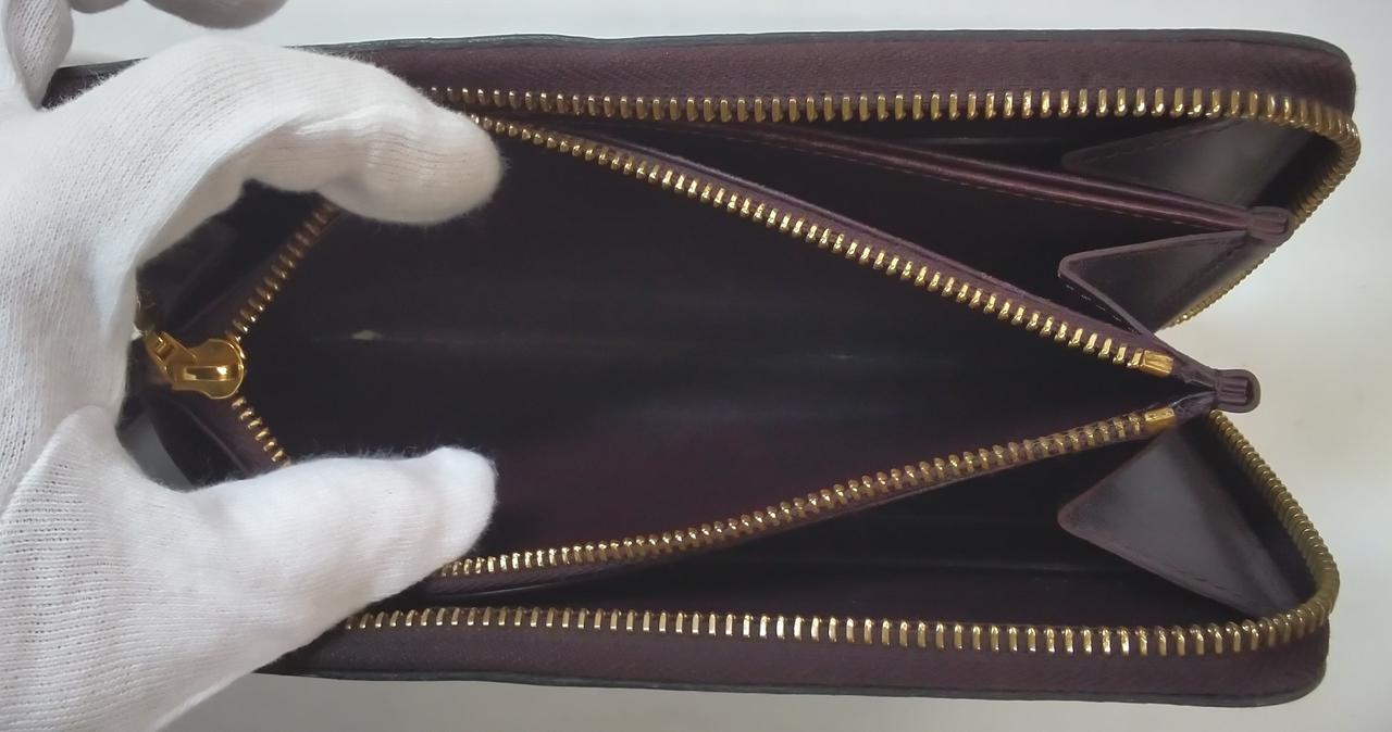 アイコニックなモノグラム柄が型押しされており、艶やかな光沢が高級感を演出します。ラウンドファスナー開閉式で、収納力が高いのが魅力です。