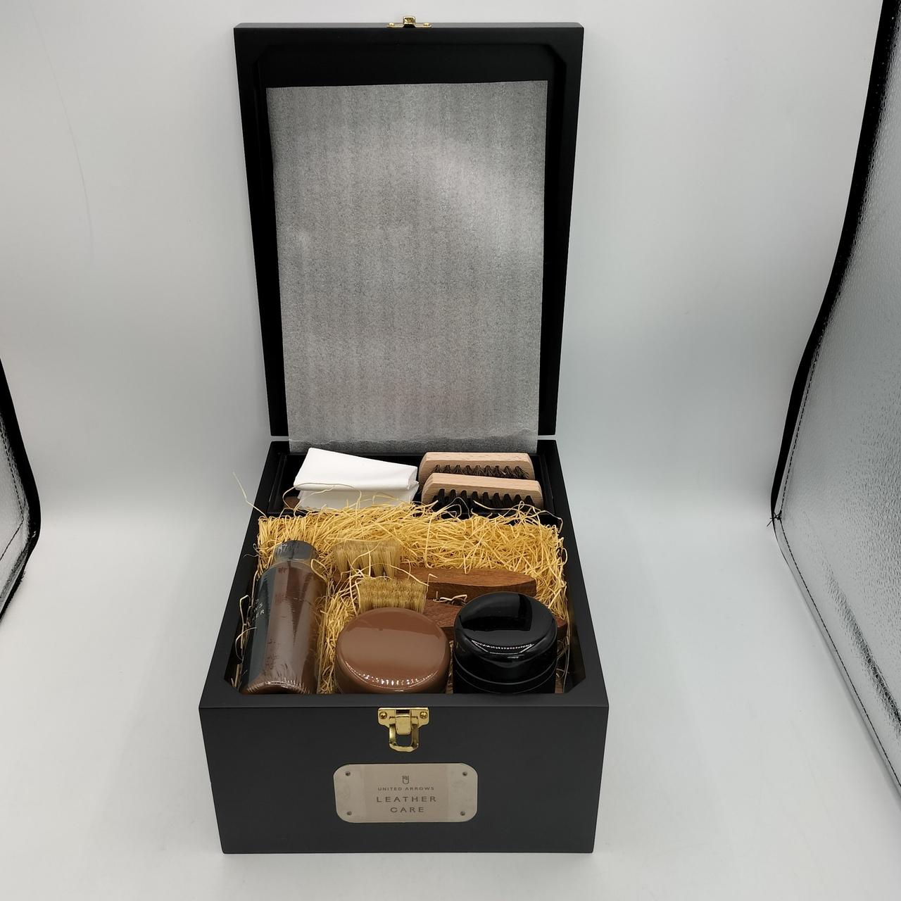 クリーナーやクリーム、ブラシなどがセットになっており、革靴、バッグ、財布などのレザーアイテムを長持ちさせるアイテムです |
