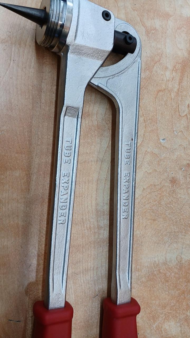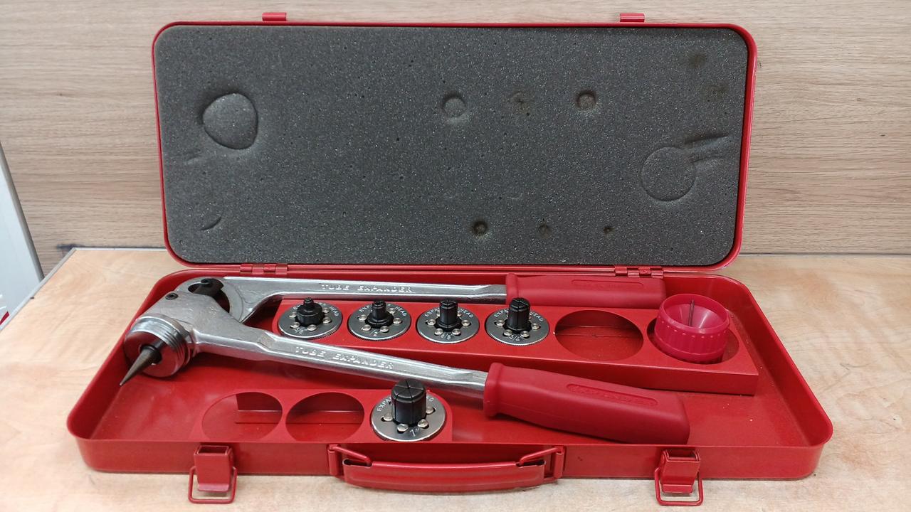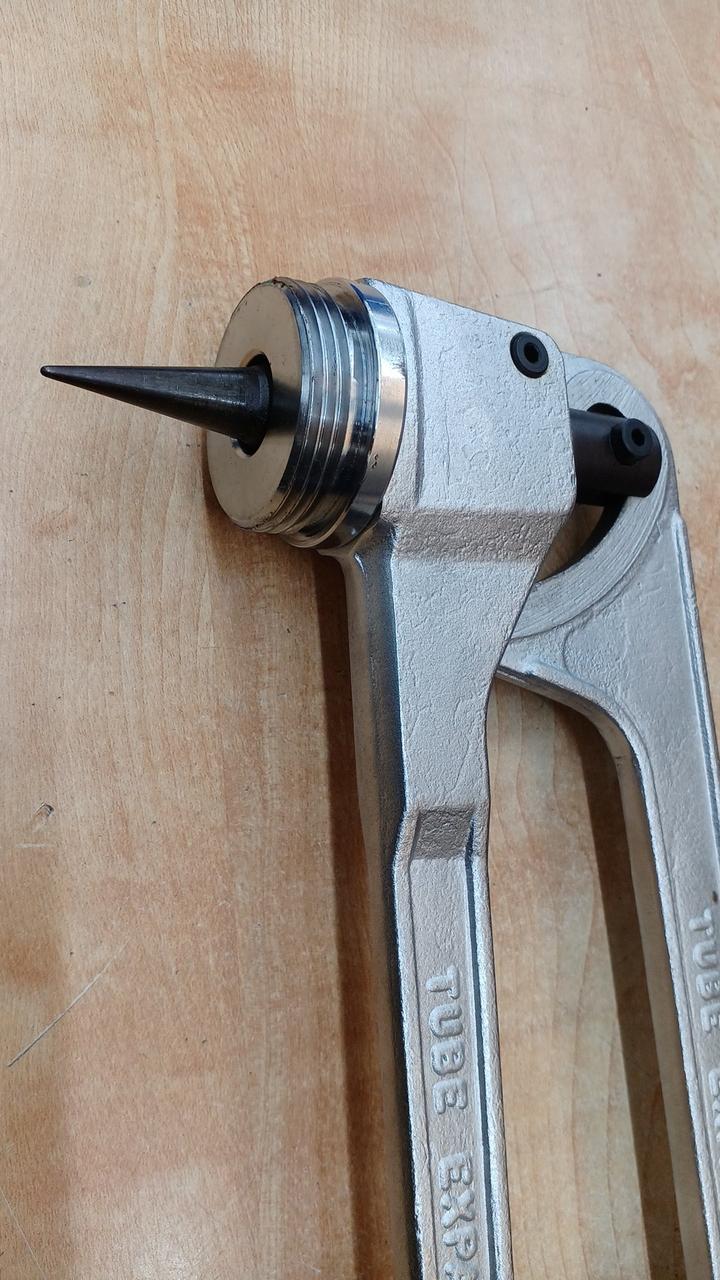 空調設備工事などで銅管の先端を広げる(拡管)ために使用される手動式のエキスパンダーです。溶接接続の際に、ソケットを使わずに銅管同士を接続できるようにします |