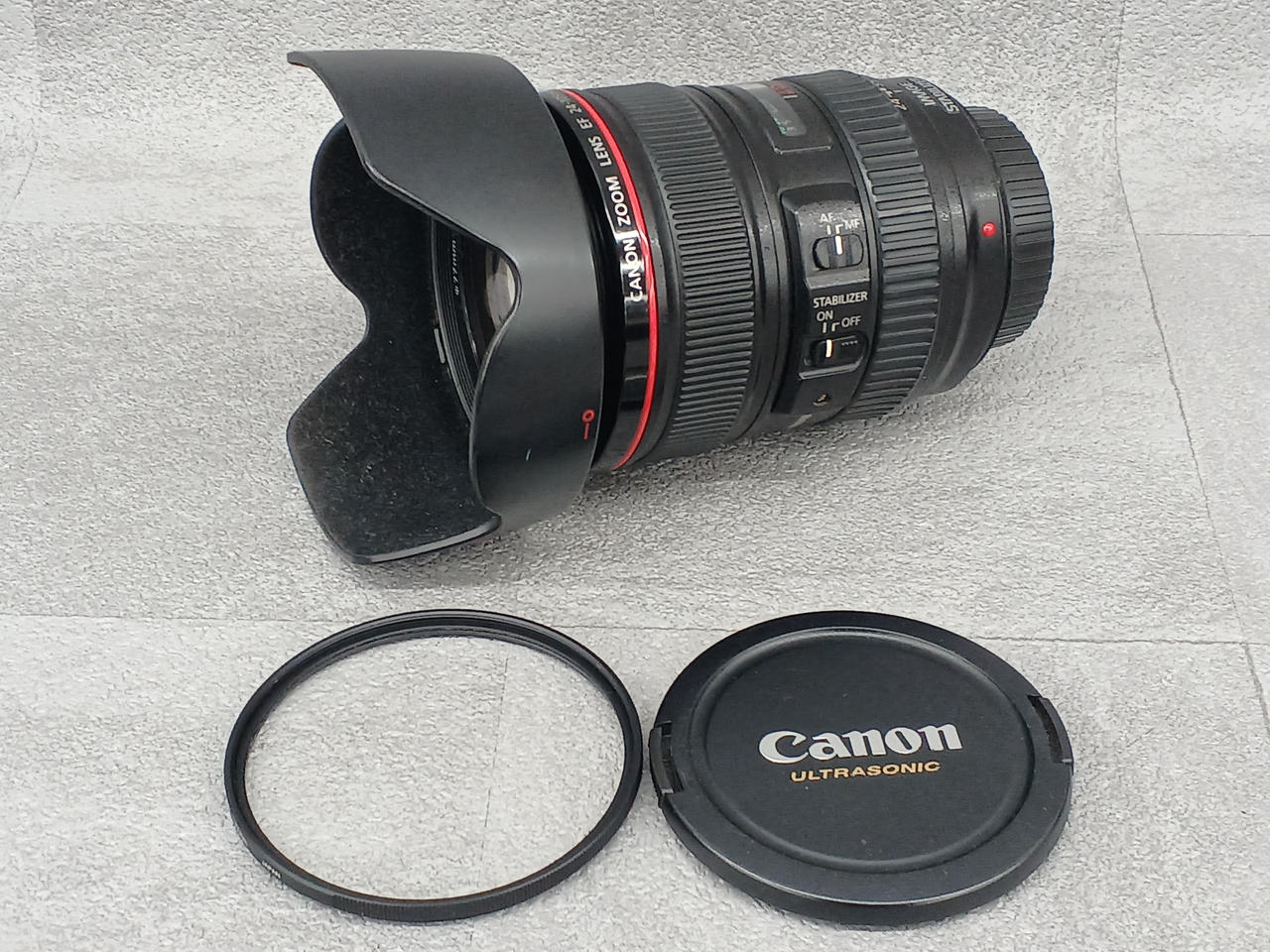 フードなスレキズ多いですが、レンズ自体はキレイです。 保護フィルター付き