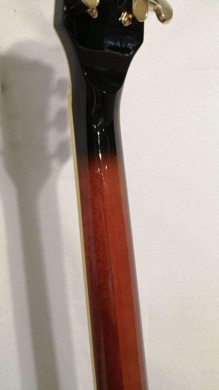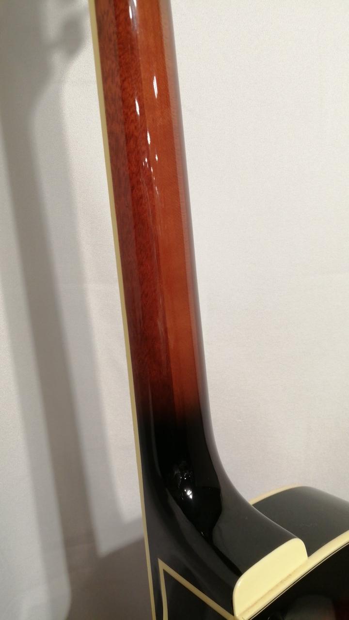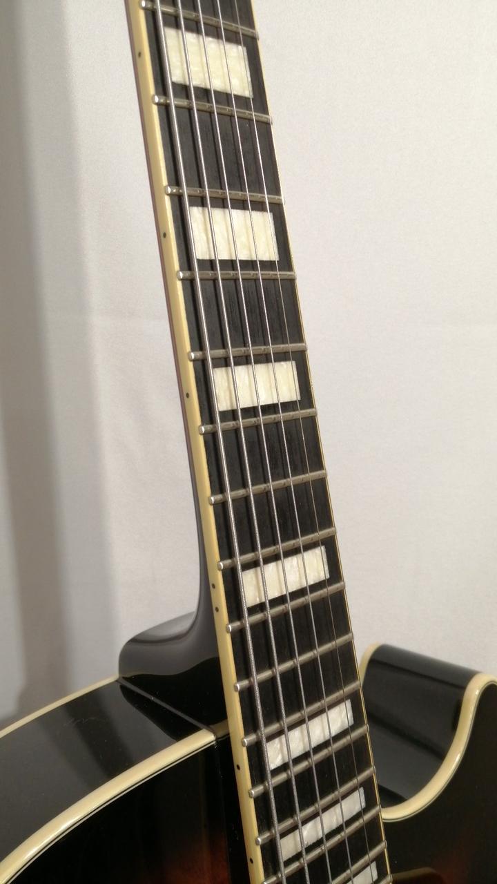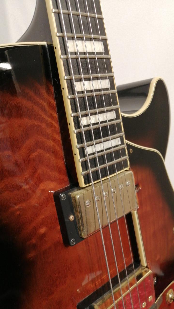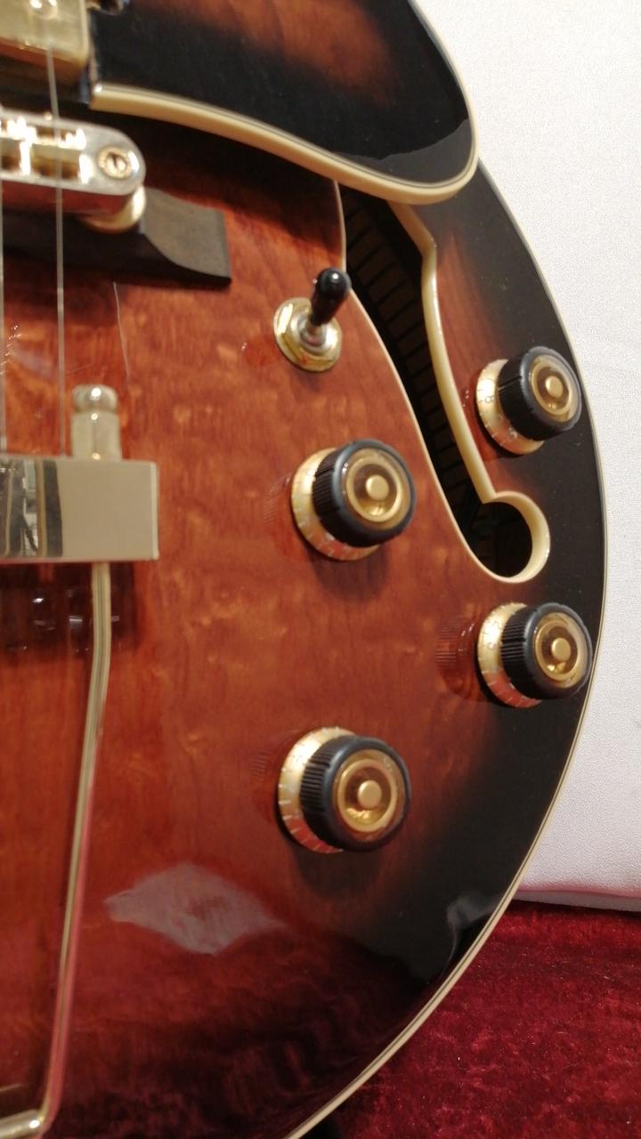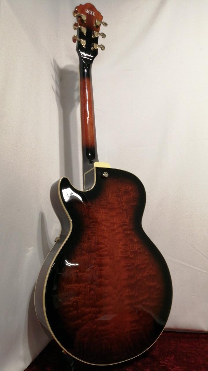 ちょっと小さめのフルアコボディ、ボディはキルテッドアッシュを採用し異彩を放つルックス。 |